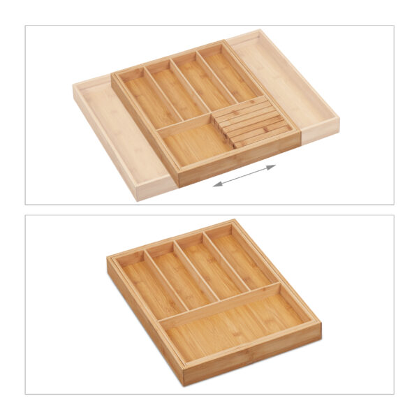 - Universalus dizainas: Stalo įrankių padėklas turi 5 pagrindinius ir 2 ištraukiamus skyrelius, kurie suteikia daug vietos stalo įrankiams, didesniems virtuviniams peiliams ir įvairiems maisto ruošimo įrankiams.