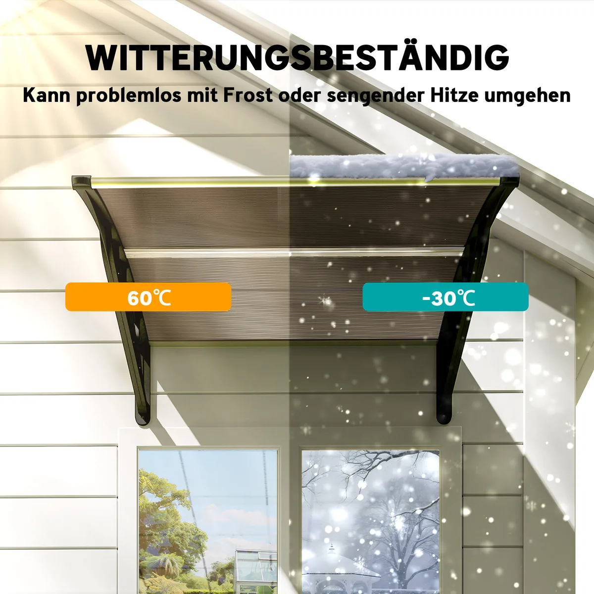 - ✔ Efektyviai apsaugokite langus ir duris nuo lietaus, sniego ir UV spindulių