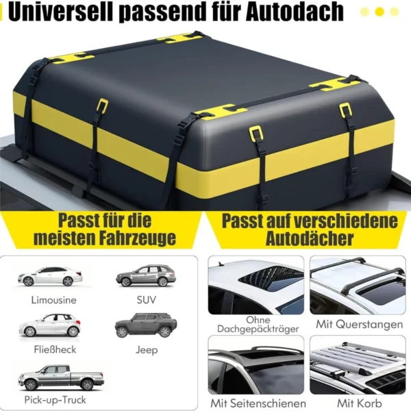 - Universalus tvirtinimas – 10 sustiprintų diržų ir 6 durų kabliai užtikrina saugų pritvirtinimą prie įvairių automobilių stogų.