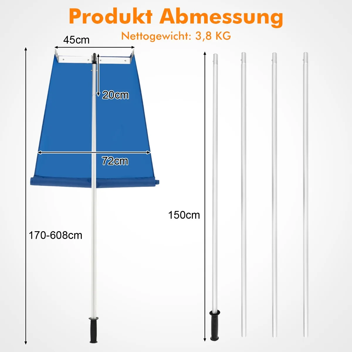 - Aukščio reguliavimas nuo 170 cm iki 608 cm su trimis nuimamais ilgintuvais.