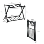 Stovas lagaminui 68x43x58cm, juodos spalvos – patogus ir patvarus sprendimas bagažo laikymui namuose ar viešbučio kambaryje. Tvirtos geležinės konstrukcijos dėka, stovą galima naudoti įvairiems daiktams laikyti, užtikrinant tvarką ir erdvės optimizavimą.