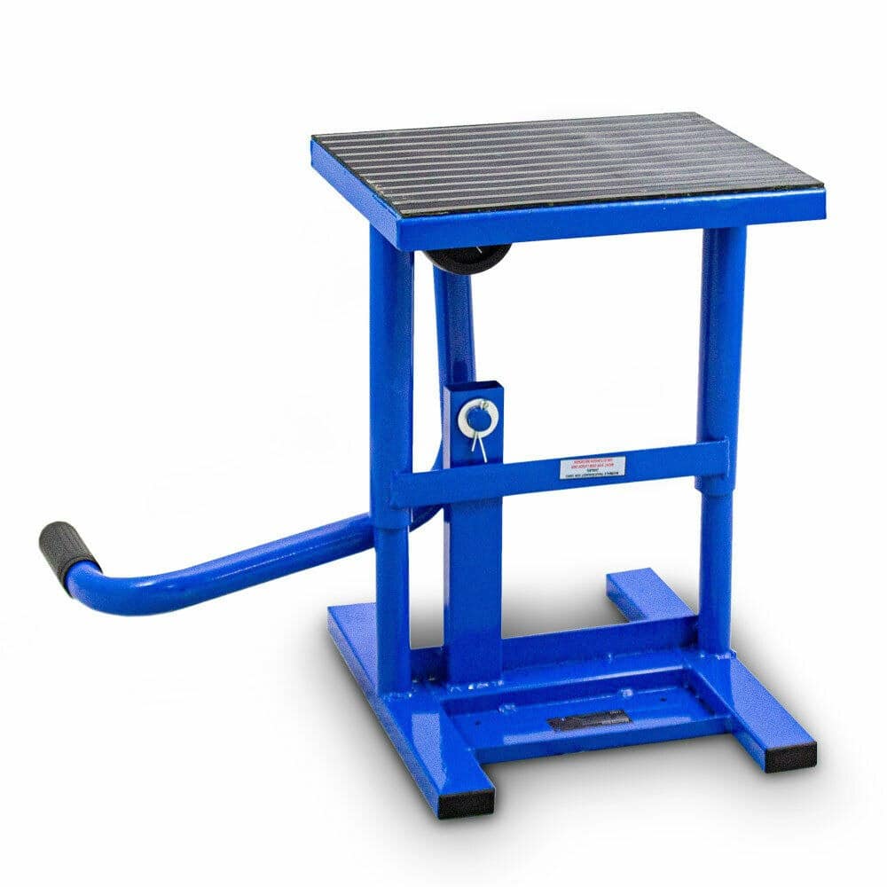 Kėlimo stovas visiems priežiūros, remonto ir aptarnavimo darbams. Puikiai tinka motokroso ir enduro motociklams. Didelė guma dengta platforma užtikrina saugų kėlimą ir stabilumą. Stovas turi kėlimo funkciją su svirtimi. Maksimalus aukštis yra 41 cm, o tai labai palengvina patekimą į visus kampelius ir be reikalo neįtempiant stuburo. Tai tobula įranga, kuri turėtų būti kiekvienoje dirbtuvėje ir garaže. ; Techniniai duomenys: Maksimali apkrova: apie 150kg, Minimalus aukštis: 31cm, Maksimalus aukštis: 41cm, Atraminio paviršiaus dydis (platforma): 29x24cm. PAPILDOMA: 1x pakeliamas stovas.