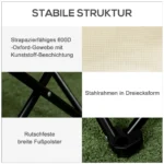 Kompaktiška kempingo kėdė Outsunny puikiai tinka įvairiai veiklai: išvykoms stovyklauti, iškyloms, festivaliams ar stebėti, kaip vaikas sportuoja. Plieninis rėmas užtikrina tvirtą atramą, o sulankstoma konstrukcija leidžia lengvai transportuoti. Plastiku dengta medžiaginė sėdynė apsaugo nuo lengvo ir vidutinio oro, o šone yra tinklinė kišenė.