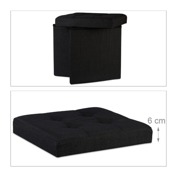 Pristatome jums elegantišką ir funkcionalią sulankstomą sėdimąją vietą, kuri puikiai tiks bet kuriame interjere. Ši juodos spalvos kubo formos taburetė ne tik suteiks papildomą sėdimąją vietą, bet ir padės tvarkingai laikyti įvairius daiktus.