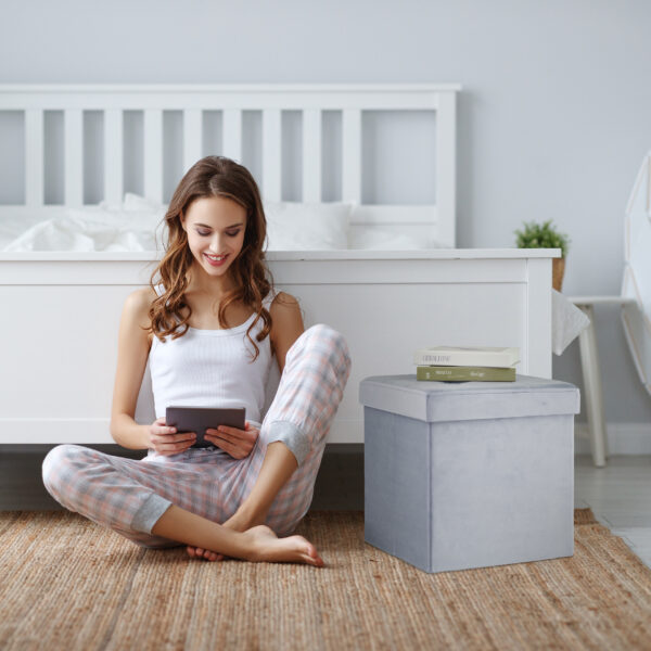 - Stilingas dizainas: Pilkas aksominis užvalkalas suteikia prabangos ir elegancijos, todėl taburetė tampa išskirtiniu interjero akcentu.