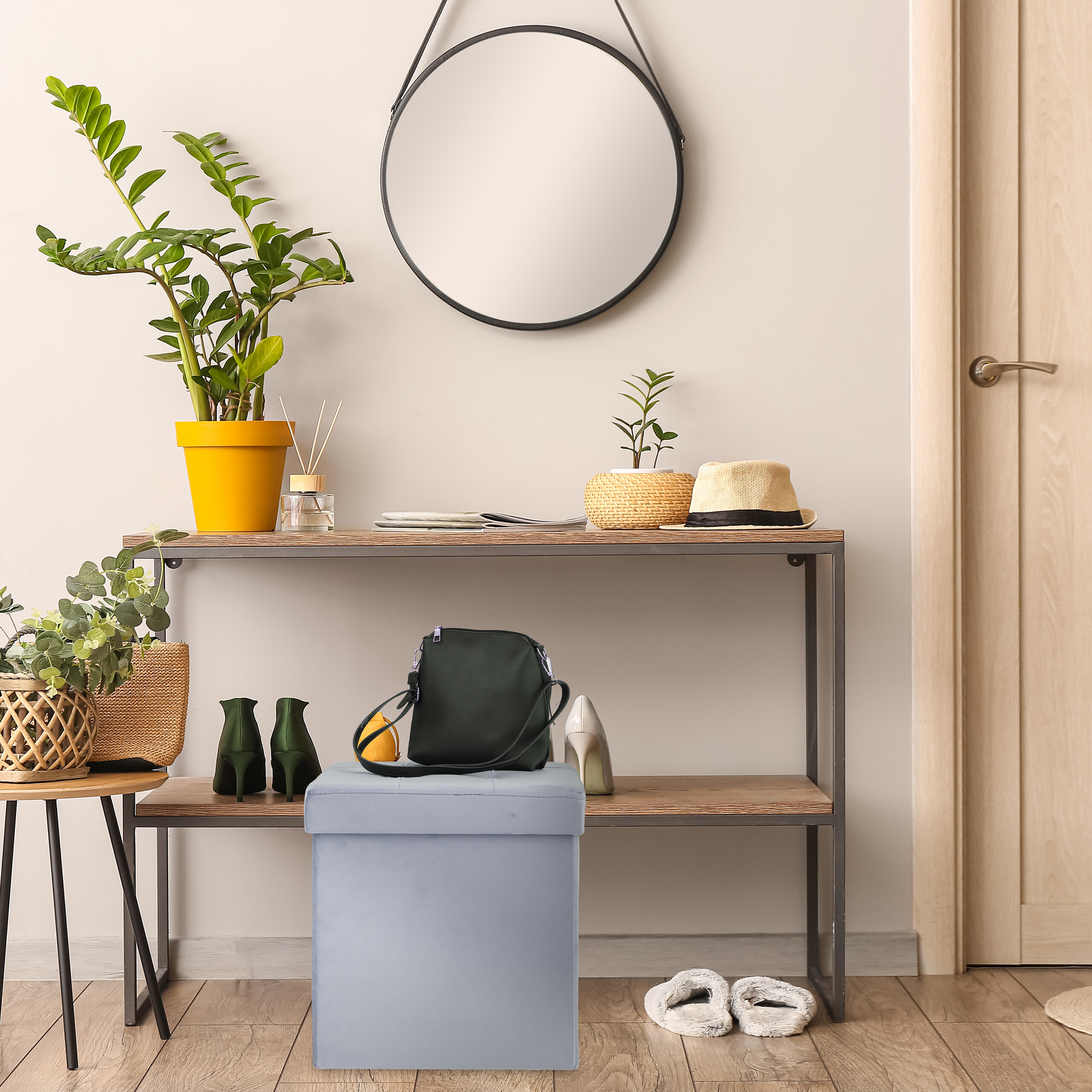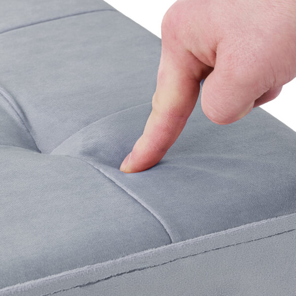 Pristatome Jums elegantišką ir funkcionalią pilkos spalvos aksominę taburetę su daiktadėže – idealų sprendimą Jūsų svetainei, prieškambariui ar kitoms gyvenamosioms patalpoms. Šis sumanus „du viename“ baldas ne tik suteiks papildomą sėdimąją vietą, bet ir padės tvarkingai laikyti įvairius daiktus.