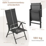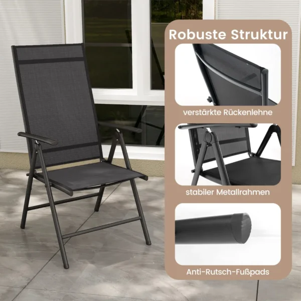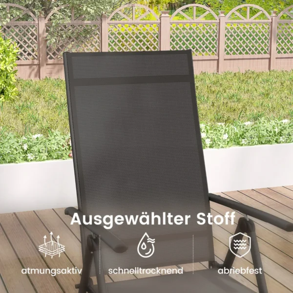 Sulankstoma sodo kėdė 75,5x52x82 cm juodos spalvos suteikia patogią sėdėjimo vietą lauko erdvėse. Kėdė tinkama naudoti sode, kieme ar prie baseino, pasižymi reguliuojamu atlošu ir greitai džiūstančiu audiniu, pritaikytu lauko sąlygoms.