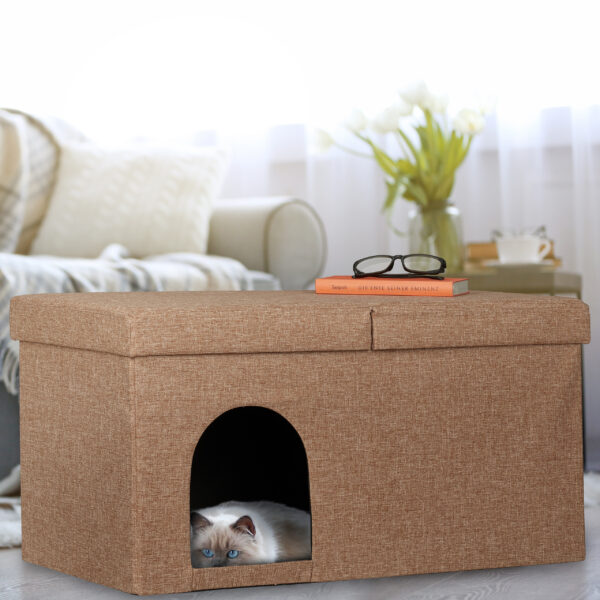 Pasirūpinkite savo katės komfortu ir saugumu su šiuo elegantišku sulankstomu kačių nameliu. Šis namelis yra ne tik funkcionalus, bet ir stilingas, puikiai derantis prie bet kokio interjero. Jo šviesiai rudos ir baltos spalvos suteikia jaukumo ir šilumos jausmą, o kompaktiškas dizainas leidžia lengvai jį pritaikyti bet kurioje namų erdvėje.