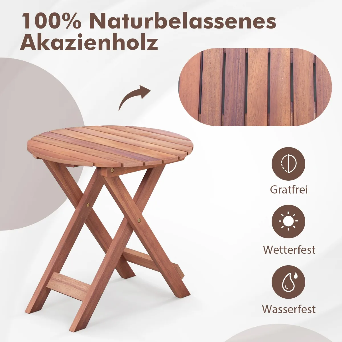 - Stalas pagamintas iš kruopščiai atrinktos akacijos medienos, kuri užtikrina ilgaamžiškumą ir atsparumą lauko sąlygoms.