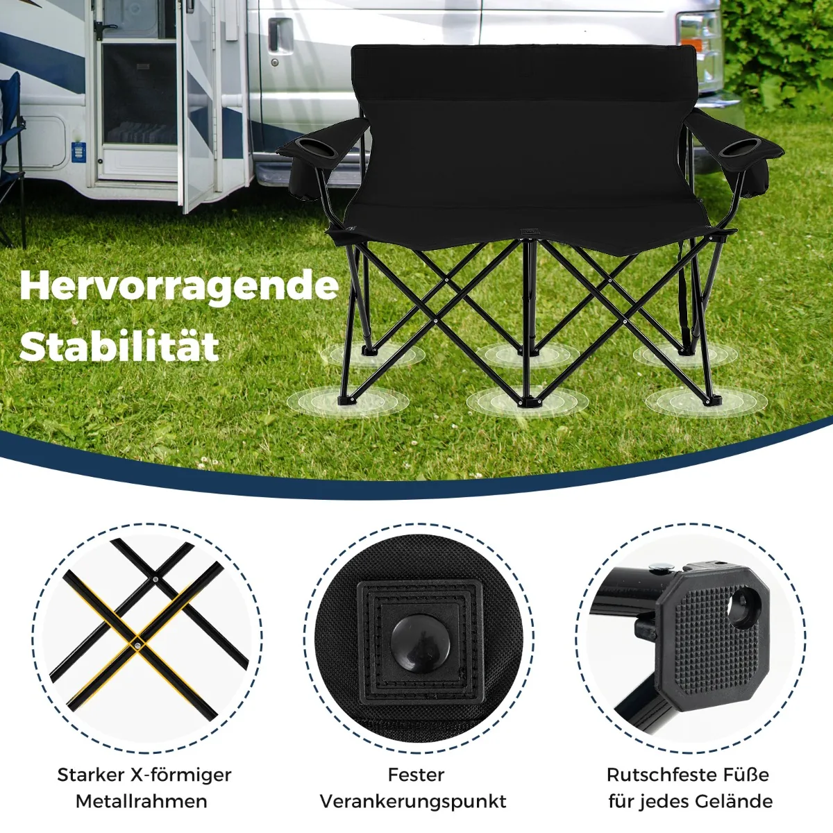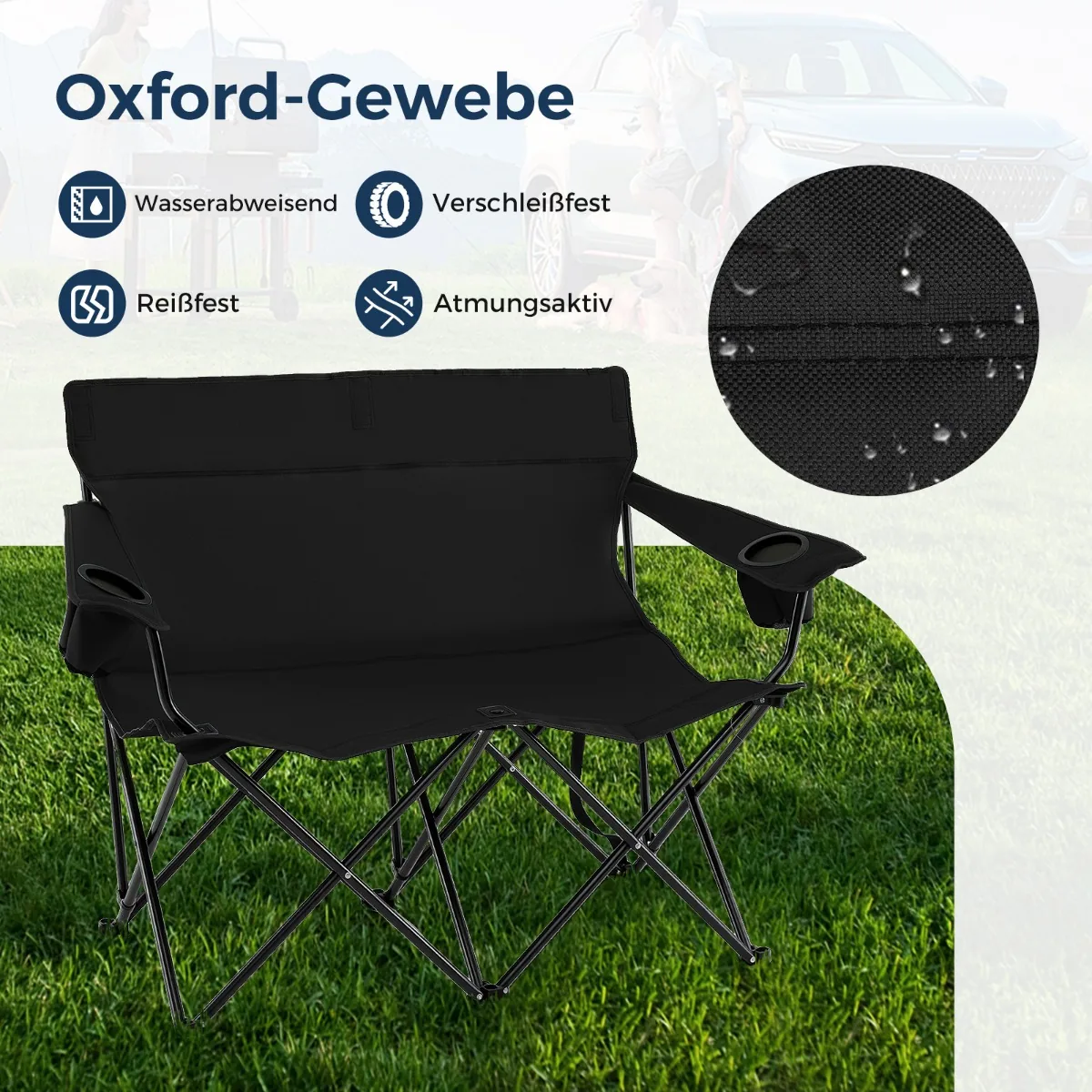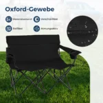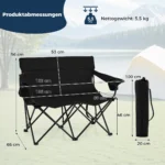 Sulankstomas suolas 132x66x96cm, juodos spalvos, puikiai tinka lauko veikloms ir stovyklavimui. Dvivietė kėdė yra patogi ir praktiška, lengvai sulankstoma bei patogi transportuoti. Tai patvari ir stabiliai sukonstruota lauko baldų dalis, pritaikyta įvairioms lauko sąlygoms.