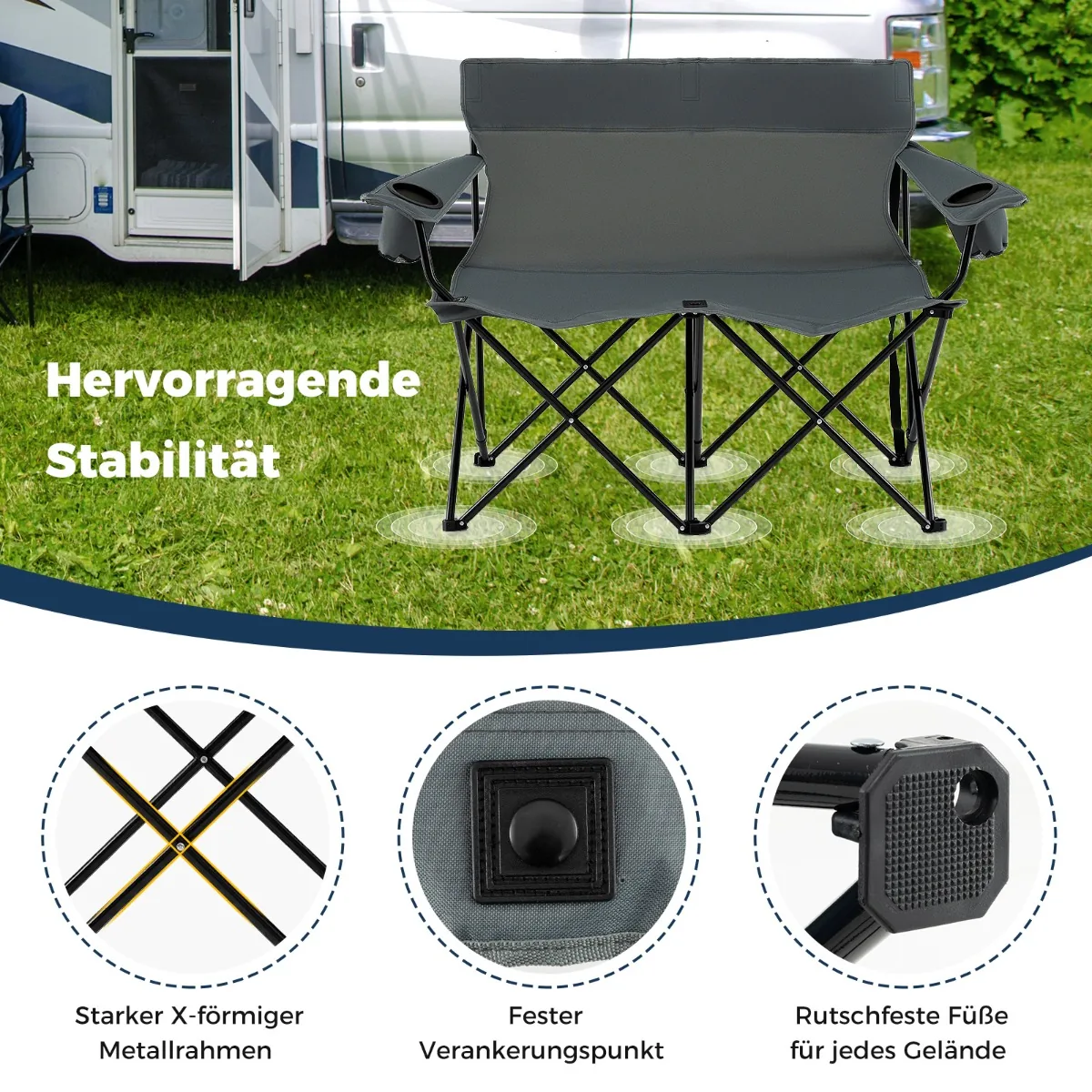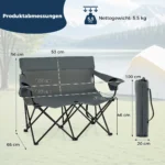 • Dvivietė sulankstoma kempingo kėdė su aukštu atlošu ir plačiais porankiais patogiam sėdėjimui.
