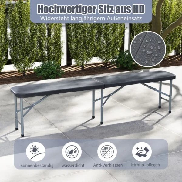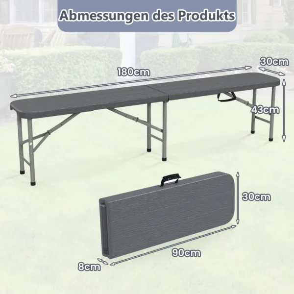 Sulankstomas suolas 180x30x43cm pilkos spalvos – praktiškas sprendimas lauko renginiams, iškyloms ir stovyklavimui. Tvirtas metalinis rėmas ir atspari HDPE sėdynė suteikia patikimą atramą ir ilgaamžiškumą. Suoliukas lengvai sulankstomas, todėl patogu jį transportuoti ir laikyti.