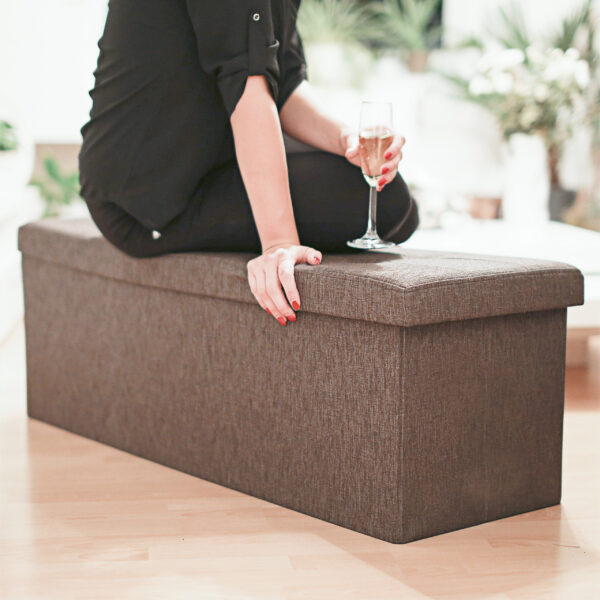 Pristatome jums aukštos kokybės sulankstomą suoliuką, kuris ne tik suteiks jūsų namams elegancijos, bet ir praktiškumo. Šis suoliukas yra pagamintas iš patvaraus lino ir turi integruotą daiktadėžę, kuri puikiai tiks pagalvėms, žurnalams, žaislams ir kitiems daiktams laikyti.
