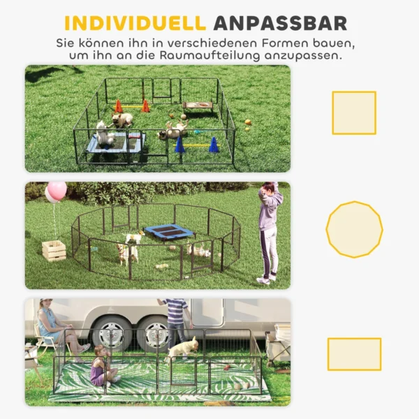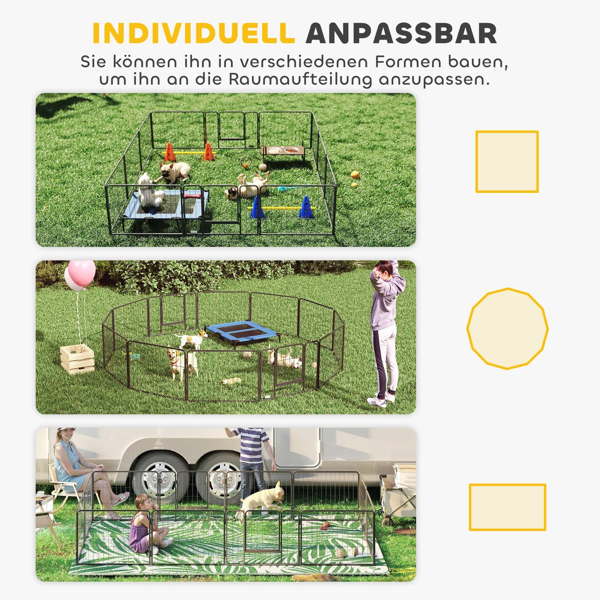 Atraskite universalų PawHut šunų aptvarą! Jį sudaro 12 pritaikomų plokščių, todėl ją galima lanksčiai suprojektuoti, kad atitiktų jūsų poreikius. Nesvarbu, ar naudojamas kaip erdvus aptvaras, ar padalintas į dvi dalis, jis leidžia atskirti skirtingus augintinius. Dvi praėjimo durys ir saugi spyna užtikrina maksimalų saugumą. Jūsų augintinis gali atsipalaiduoti ir mankštintis erdviame interjere.