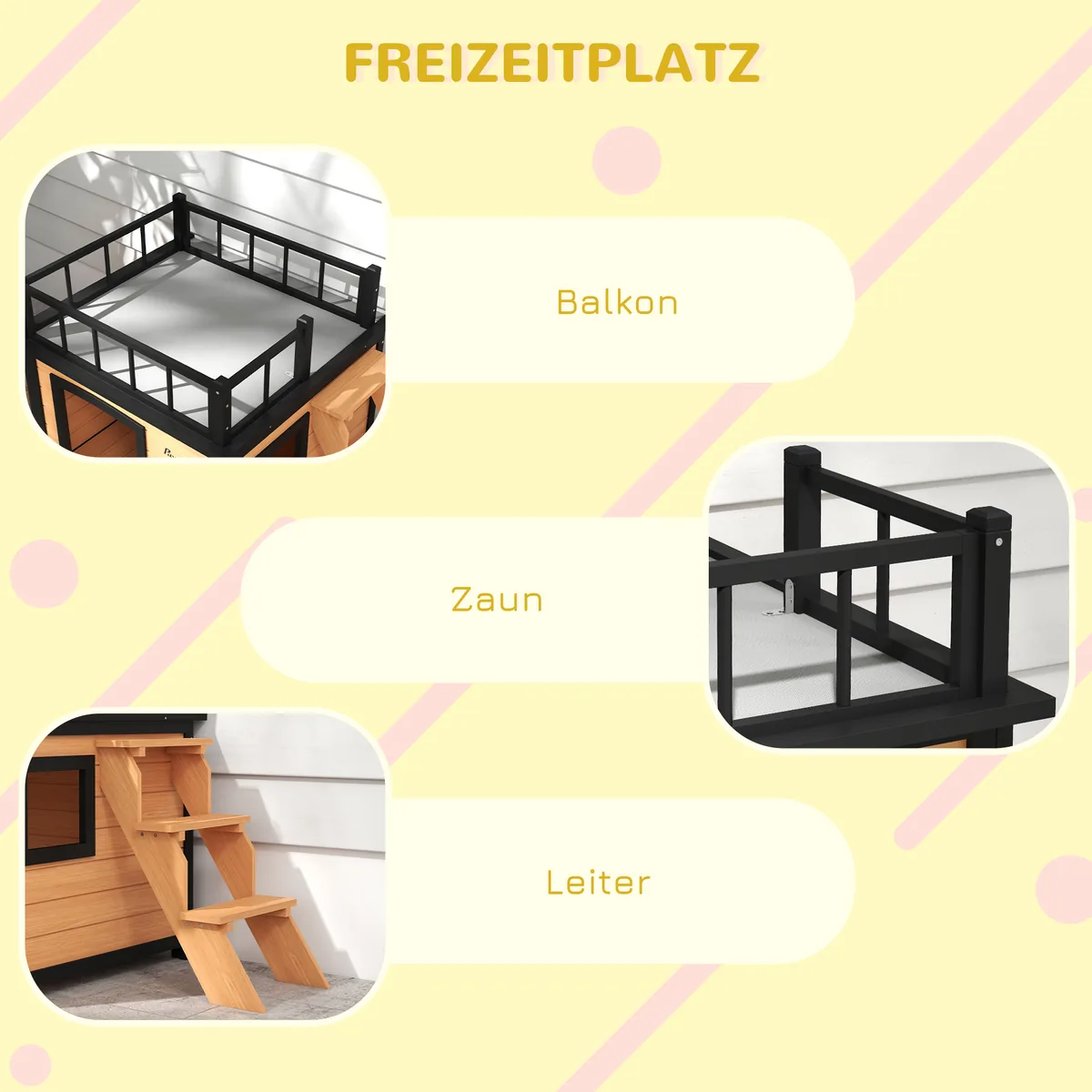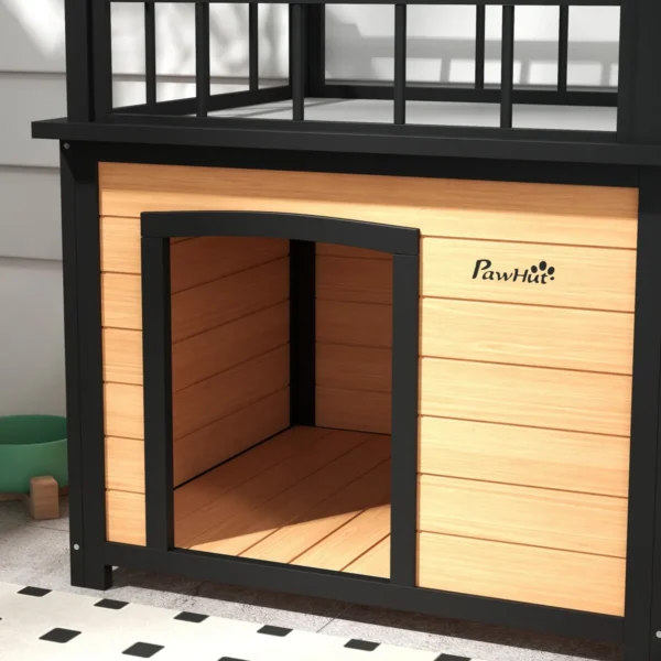 Mūsų šunų namai „PawHut“ siūlo jūsų šuniui aukščiausio lygio saugumą ir atsipalaidavimą. Dėl praktiškos stogo terasos ir kopėčių jūsų mažylis įgys papildomą nuostabią poilsio vietą saulėje. Šunų namelis yra erdvus, nepraleidžia lietaus ir suteikia jūsų kailio draugui daug judėjimo laisvės. Dėl praktiškos prošvaisos žemės drėgmei ir šalčiui taip pat neleidžiama. Langas ir durys užtikrina optimalų oro apykaitą.