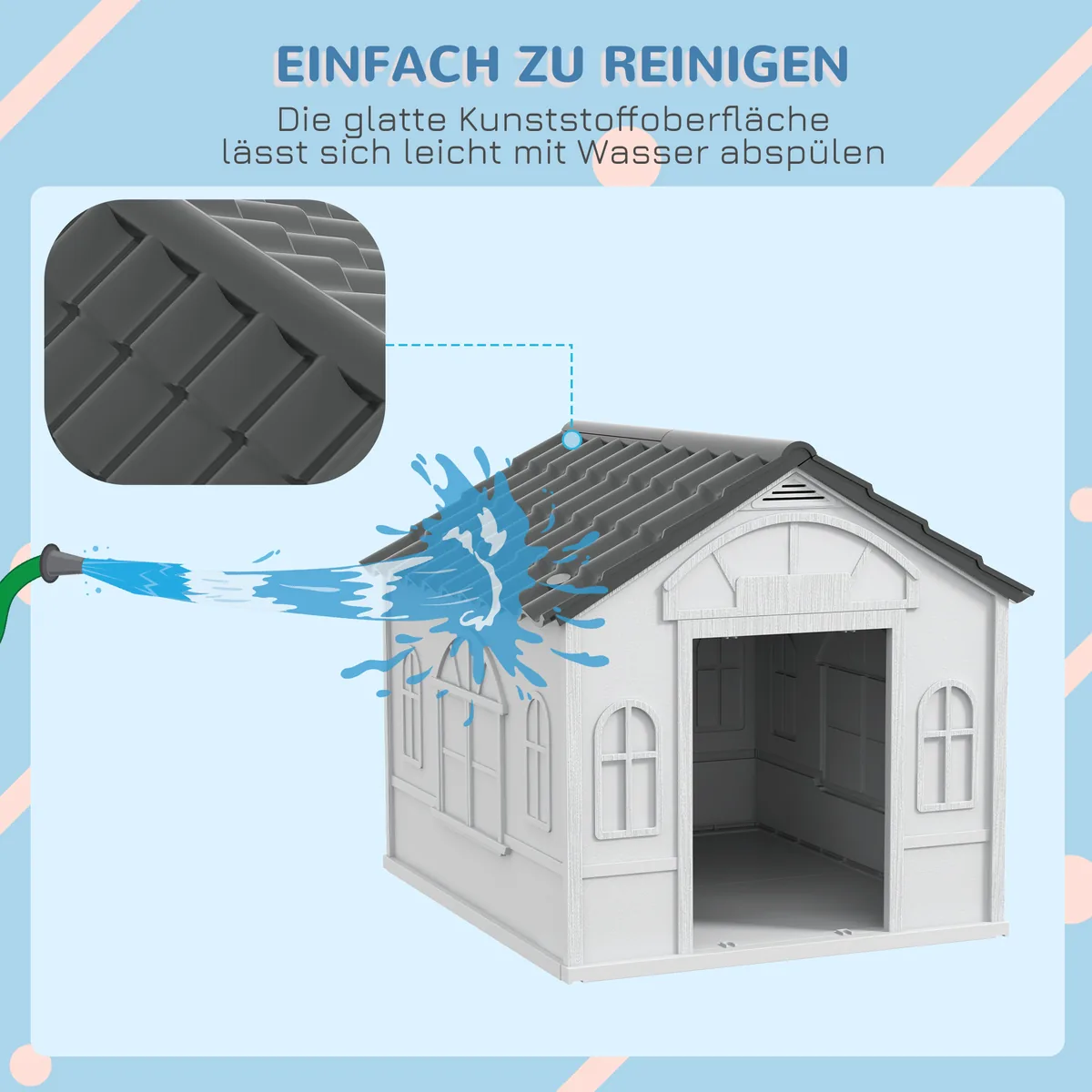 - ✔ Šunų namelis su šlaitiniu stogu, kuris padeda lengviau paslysti lietui ir vėjui: ✔ atsparumas lietui ir vėjui: ilgai išlieka sniegas,