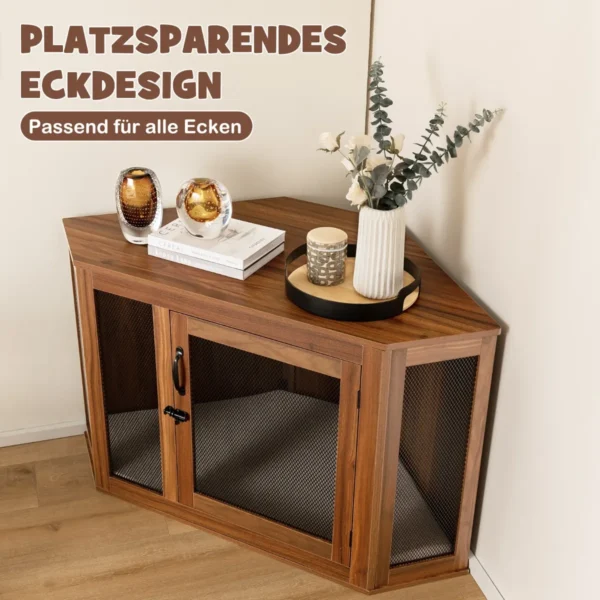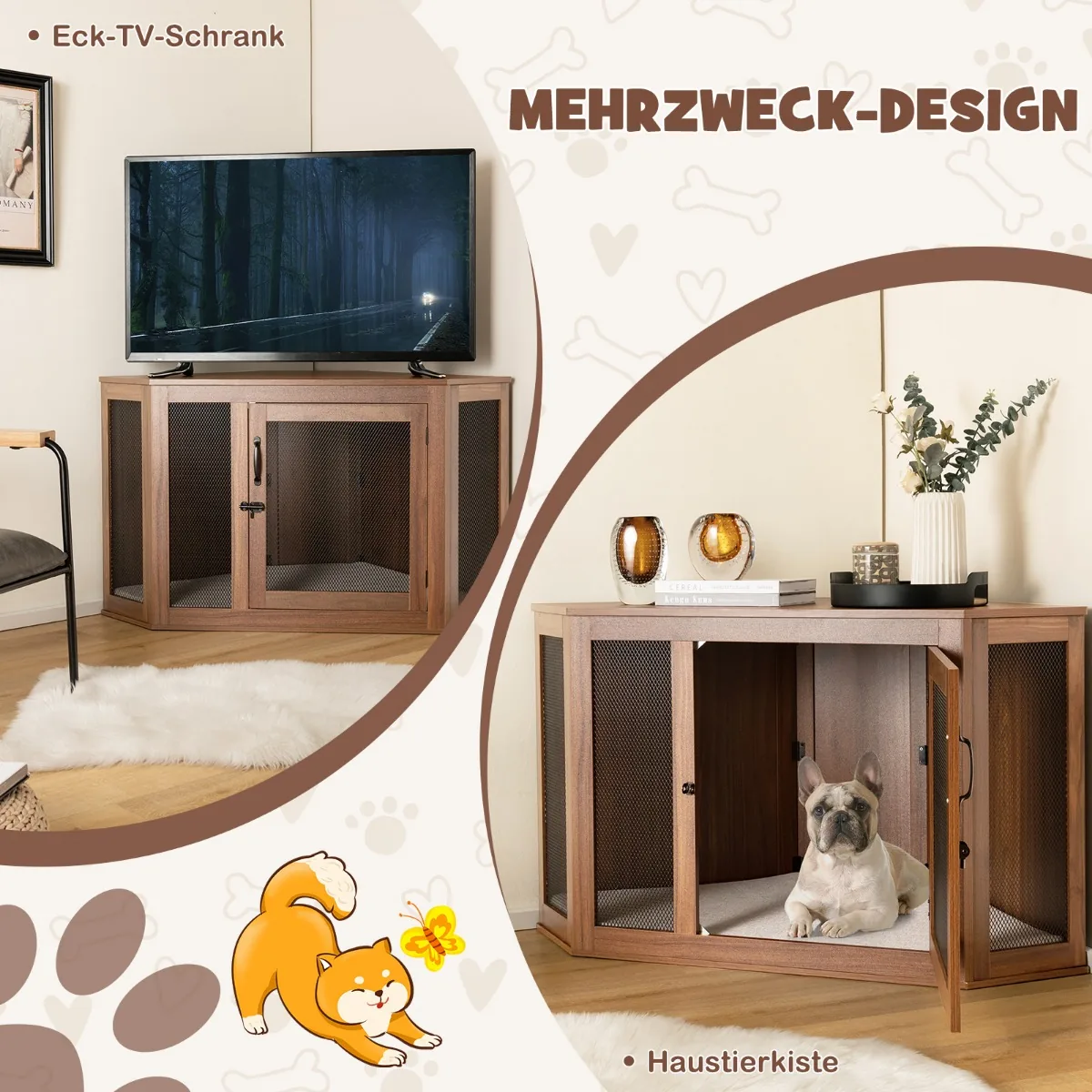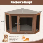 Šuns narvas 114x60x68cm, rudos ir juodos spalvos, yra funkcionali kampinė dėžė, skirta šunims ir kitiems naminiams gyvūnams. Šis narvas leidžia efektyviai išnaudoti ribotą erdvę, tuo pačiu suteikdamas patogią ir saugią poilsio vietą augintiniui.