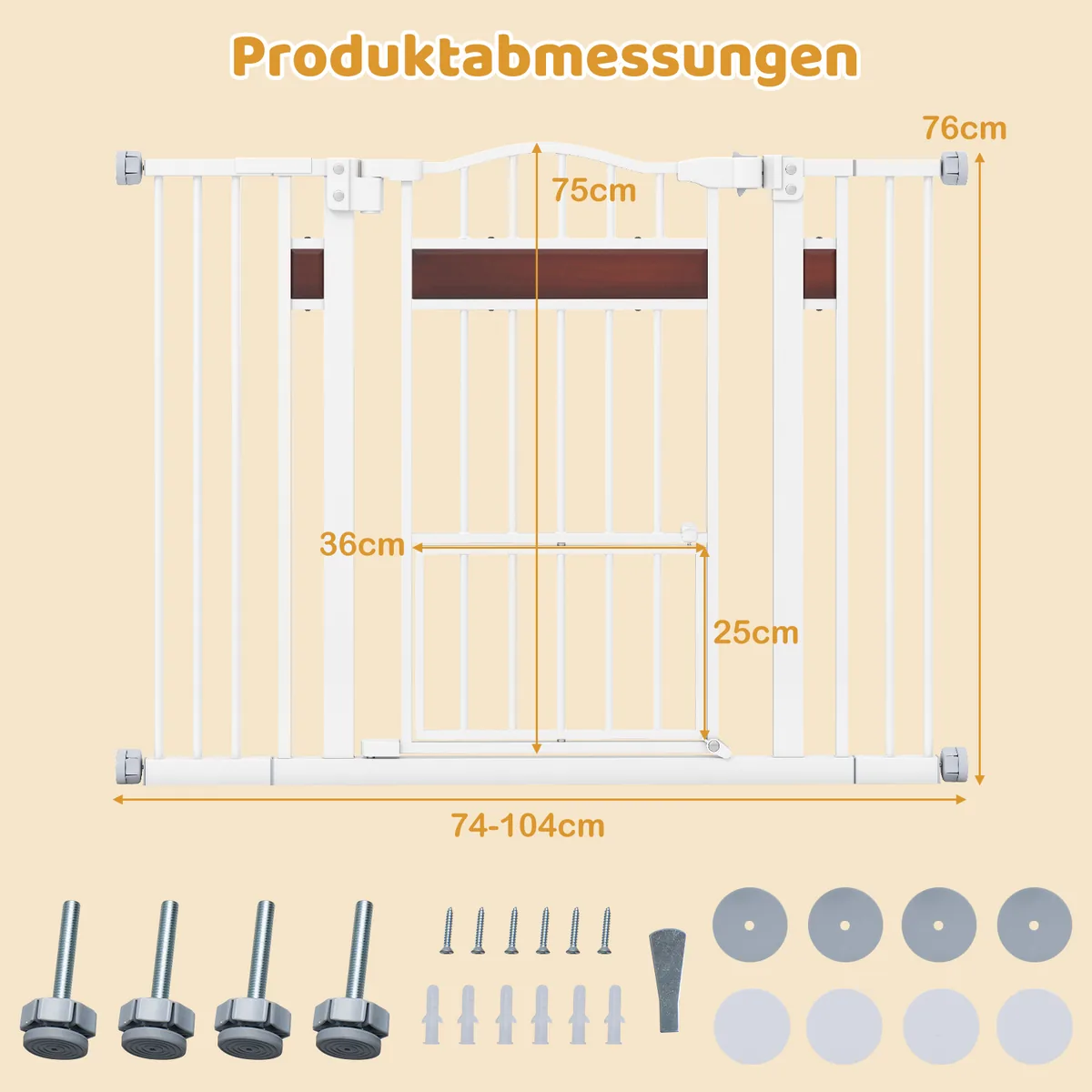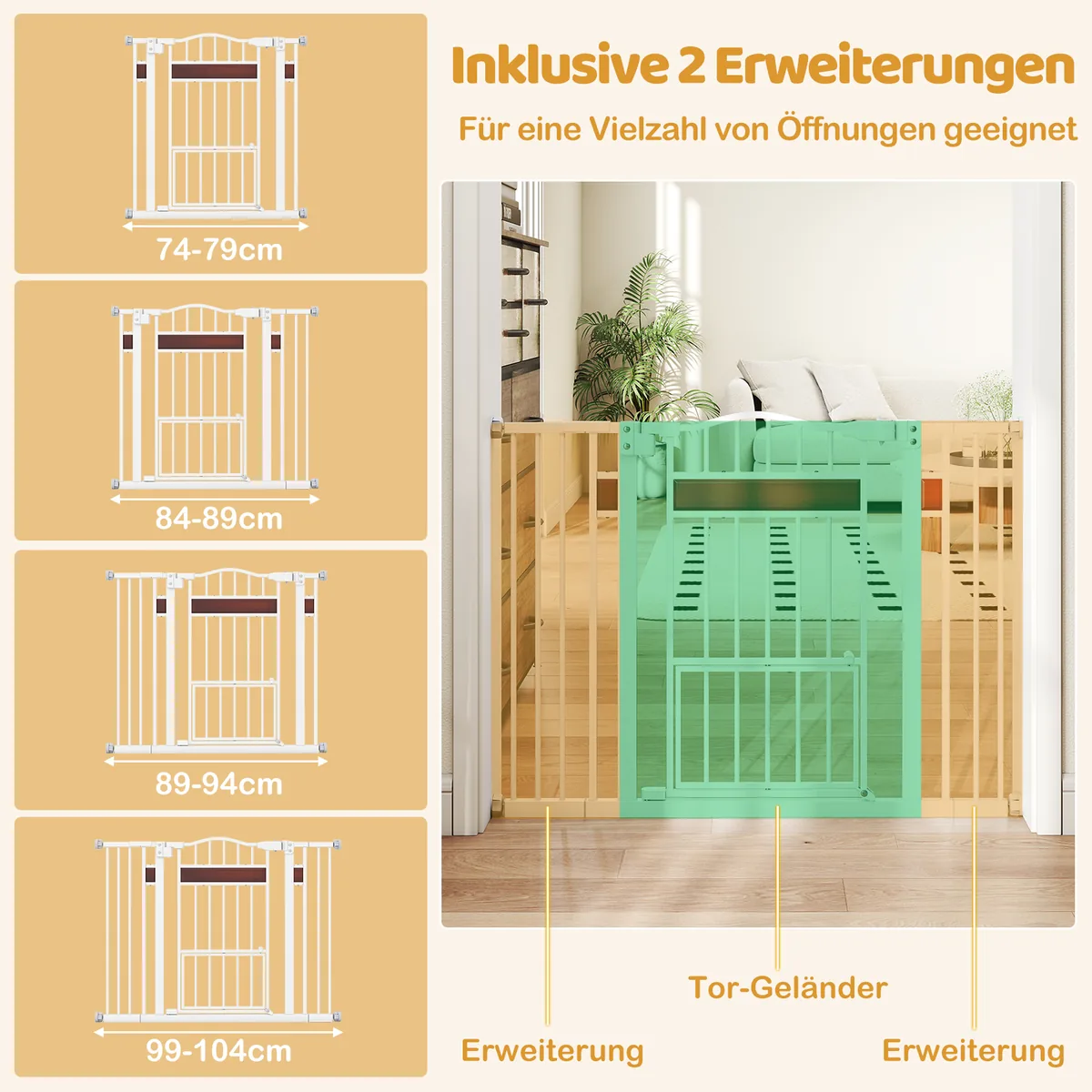 Šunų apsauginiai vartai 104x76cm, baltos spalvos, yra patikima priemonė saugiai atskirti gyvenamąsias erdves ir apsaugoti augintinius. Reguliuojamo pločio vartai puikiai tinka durų angoms, laiptams ar koridoriams, užtikrinant kontrolę ir saugumą vidutinio ir mažo dydžio šunims bei katėms.