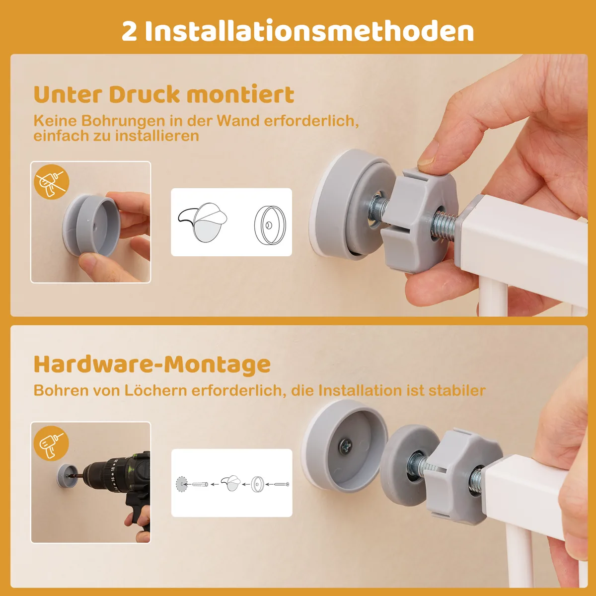 - Itin platūs apsauginiai vartai su dviem prailginimais – reguliuojami nuo 74 cm iki 104 cm pločio, tinkami įvairioms erdvėms.