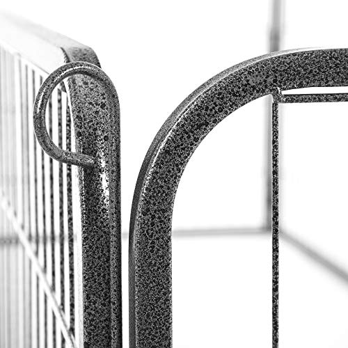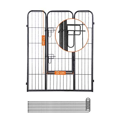 Metaliniai šio šuniuko bėgimo strypai turi užapvalintus kampus, todėl jūsų mažasis draugas negali susižaloti žaisdamas. Švaistikliai taip pat gali būti įsmeigti į žemę, jei naudojate narvą sode, suteikdami maniežui papildomą stabilumą.