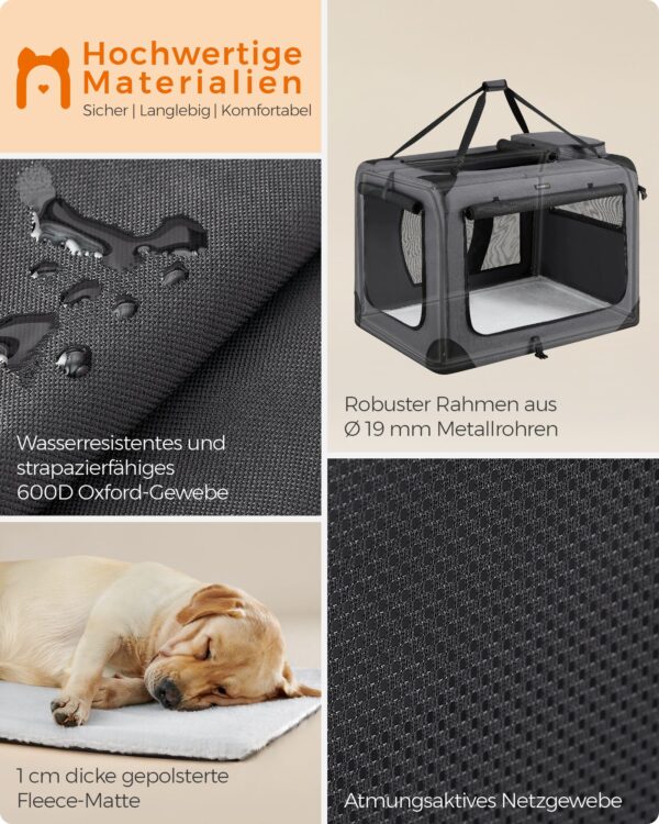 Šis transportavimo krepšys yra pagamintas iš aukštos kokybės medžiagų, užtikrinančių ilgaamžiškumą ir atsparumą. Metalinis rėmas suteikia tvirtumo, o 600D Oxford audinys su PVC danga apsaugo nuo drėgmės ir purvo. Viduje esanti vilna suteikia papildomą komfortą jūsų augintiniui.