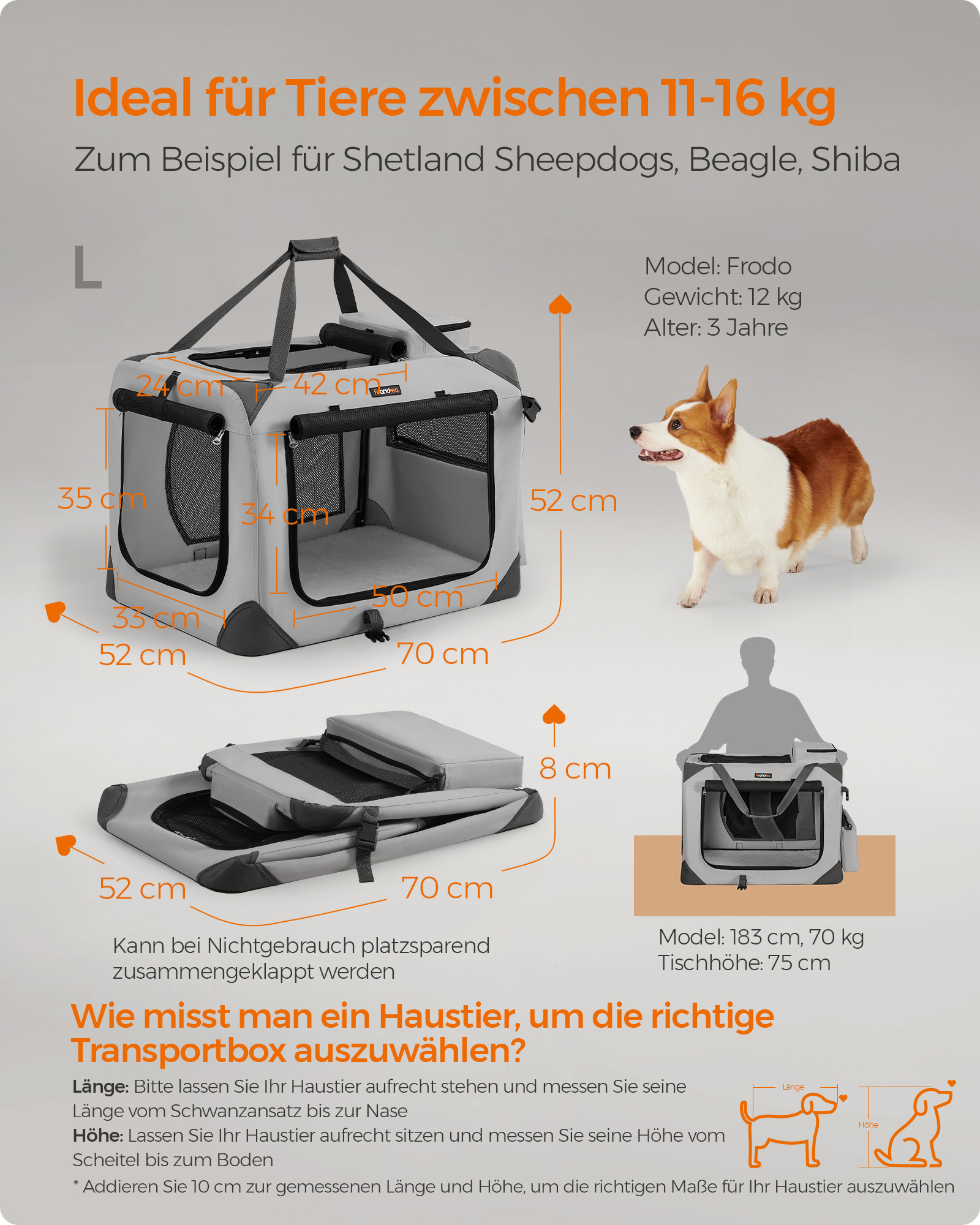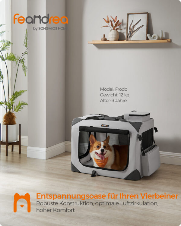 - Matmenys: 70 x 52 x 52 cm (ilgis x plotis x aukštis) – pakankamai erdvus, kad jūsų šuo jaustųsi laisvai.