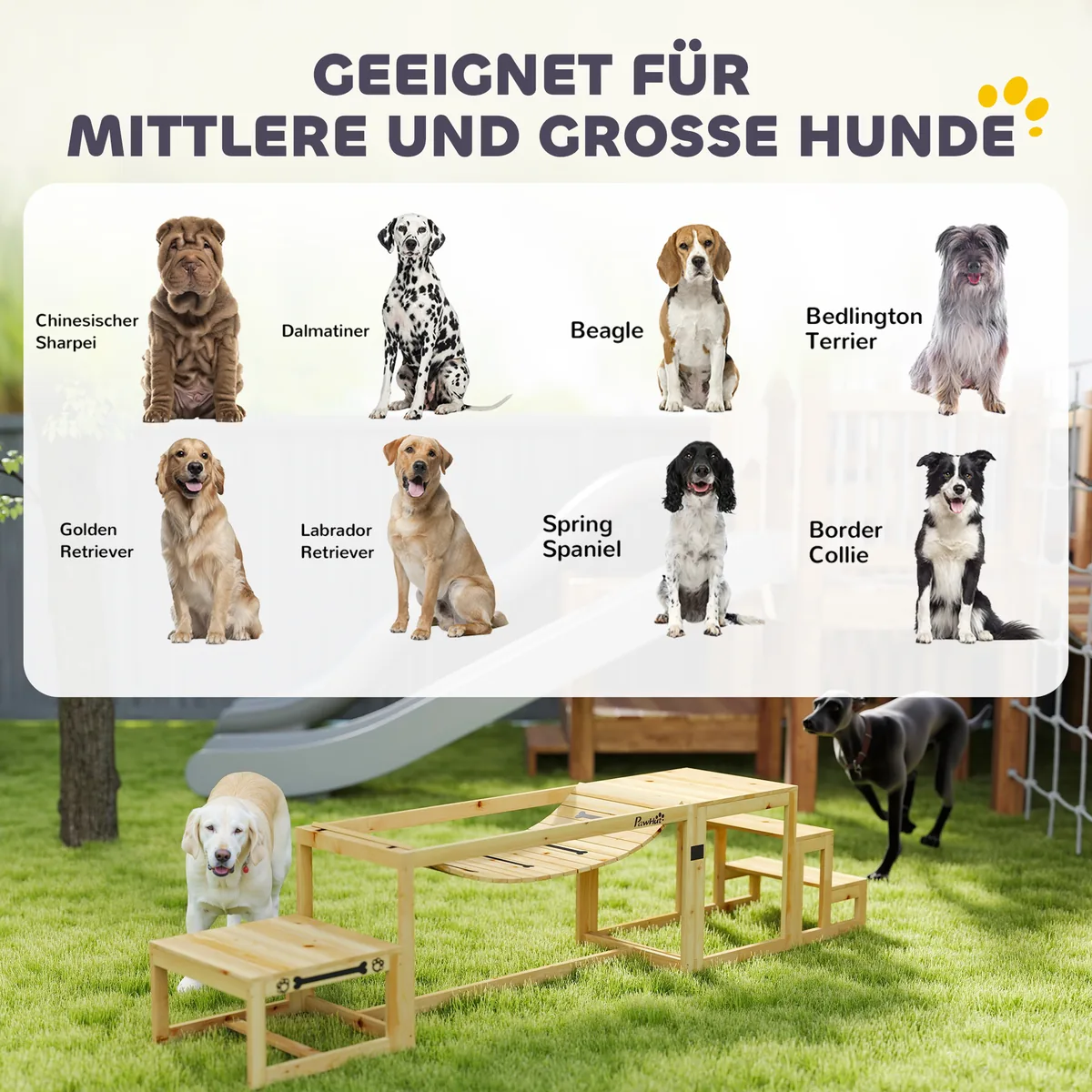 Patobulinkite savo šuns įgūdžius naudodami PawHut Agility rinkinį! Į komplektą įeina minkštas tiltelis, poilsio platforma ir laiptai, skirti įvairiems įgūdžiams lavinti. Pagaminta iš aukštos kokybės eglės medienos, tinka vidutiniams ir dideliems šunims iki 40 kg, todėl kiekviena treniruotė yra maloni.