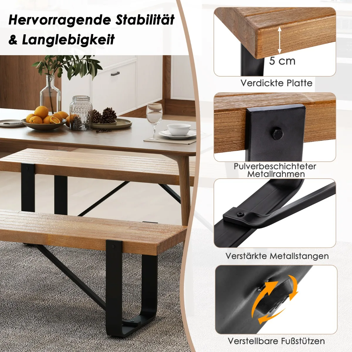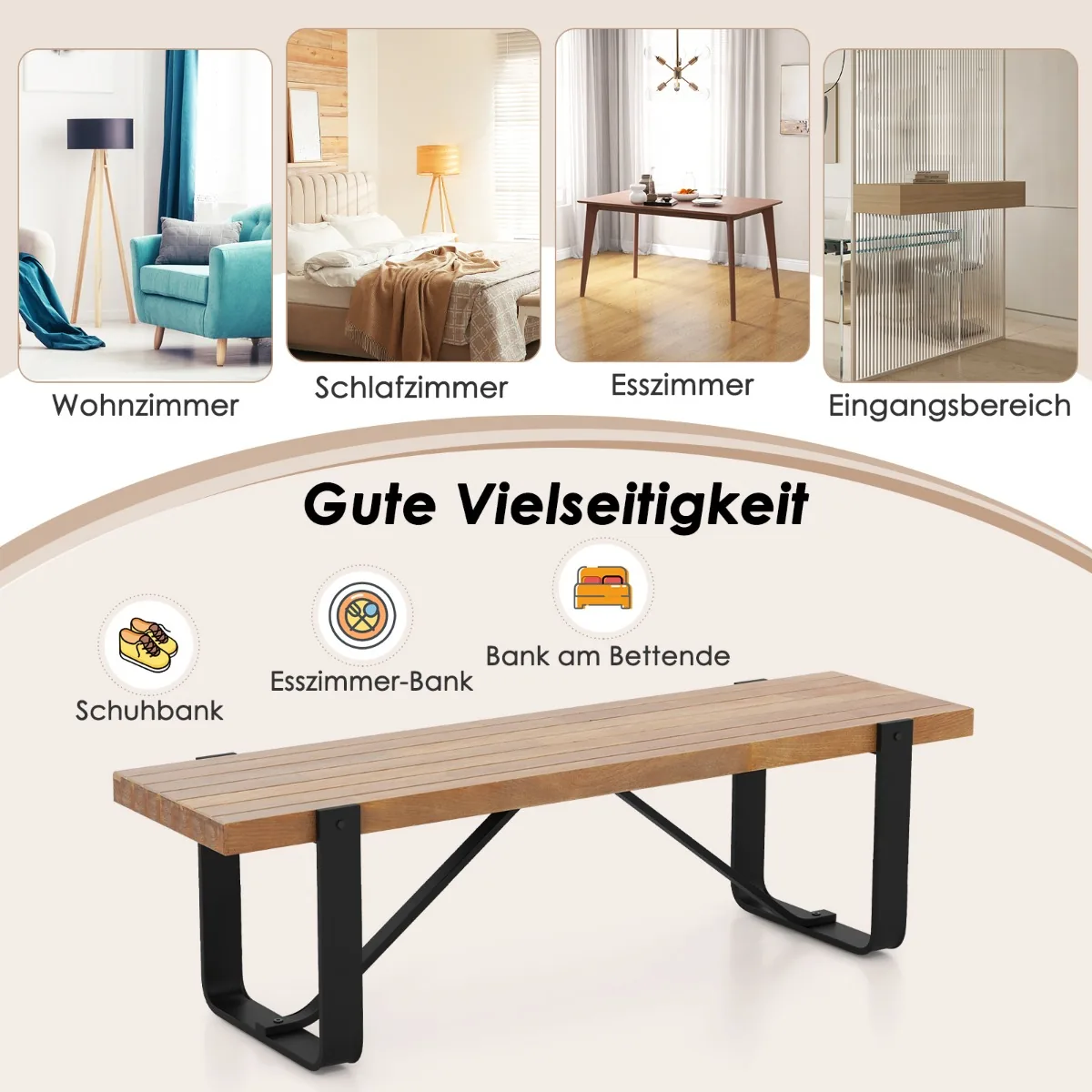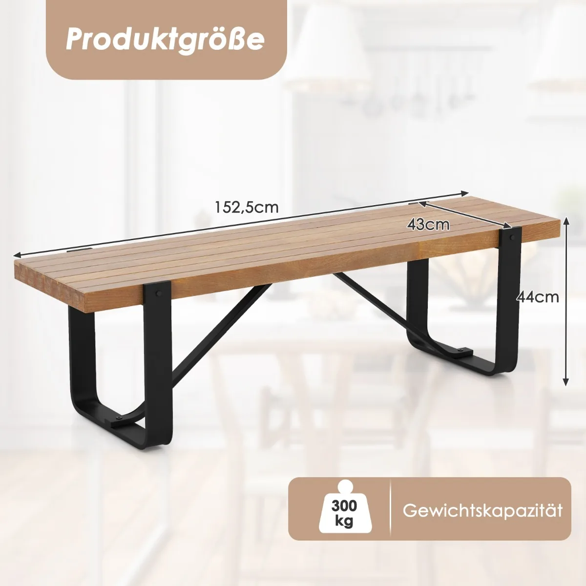 Prieškambario suolas 152,5x43x44cm, šviesiai rudos ir juodos spalvos, skirtas universaliam naudojimui namų erdvėse. Pagamintas iš tvirto metalinio rėmo ir MDF, suoliukas atlaiko iki 300 kg svorį, todėl užtikrina patikimą sėdėjimą keičiant batus ar papildomos vietos suteikimą.