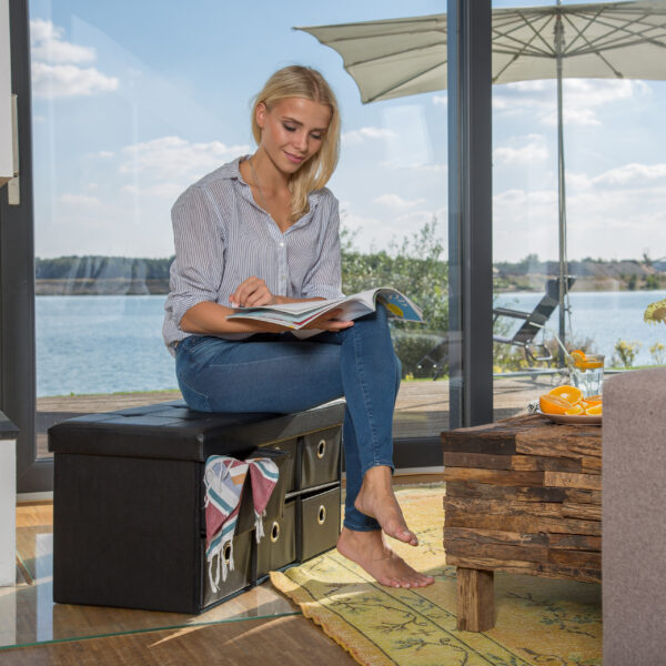 - Praktiškas sandėliavimas: Suolas turi 6 skyrius, kuriuose galite laikyti įvairius daiktus, tokius kaip žurnalai, vilna, hi-fi aksesuarai ar žaislai. Viskas dabar turi savo vietą ir gali būti lengvai pasiekiama.