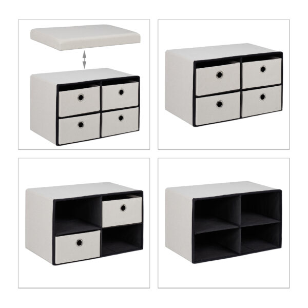 - Praktiškas laikymas: Medžiaginė skrynia su 4 stalčiais leidžia patogiai susidėti drabužius, tokius kaip šalikai, kepurės ir pirštinės, arba laikyti žaislus.