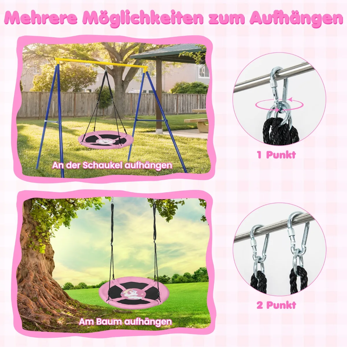 Vaikų sūpynės 102×173 cm rožinės/juodos spalvos puikiai tinka lauko ir vidaus erdvėms. Didelė sėdynė bei reguliuojamos virvės užtikrina patogumą ir saugumą vaikams nuo 3 metų. Sūpynės pagamintos iš patvarių medžiagų, tinkamos įvairioms oro sąlygoms.