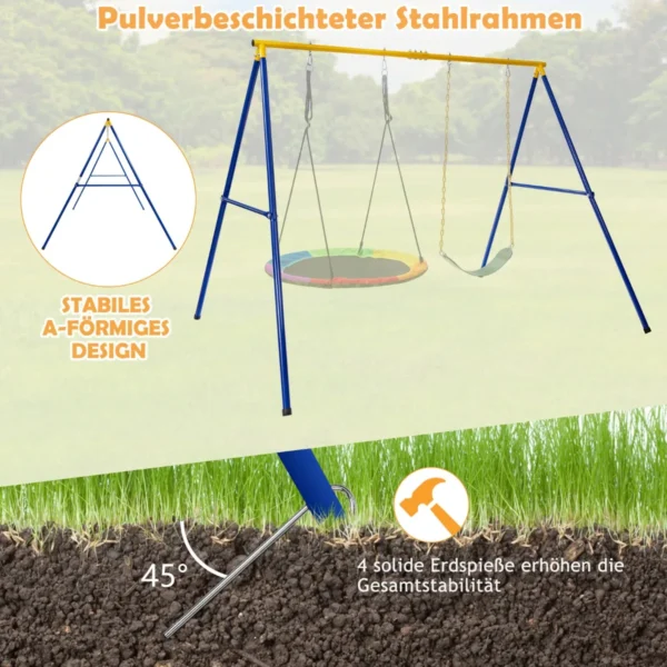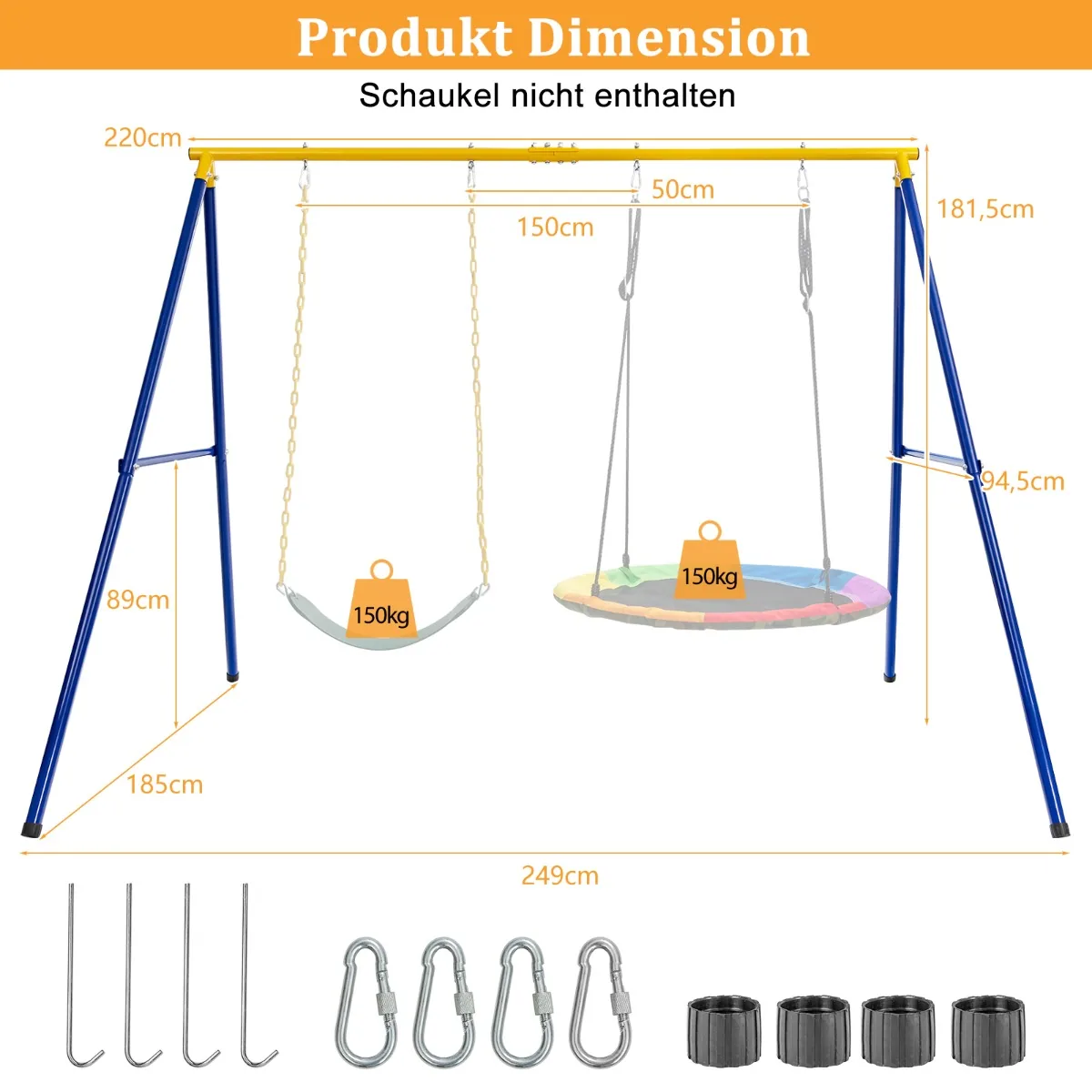 Sūpynių rėmas 249x185x181,5 cm, mėlynos ir geltonos spalvos, yra patvarus ir stabilus sprendimas lauko arba vidaus naudojimui. Tvirtas plieninis A formos rėmas skirtas įvairiems sūpynių tipams, užtikrina saugumą ir ilgalaikį naudojimą. Šis rėmas puikiai tinka šeimoms ir mažiems žaidimų aikštelių komplektams.