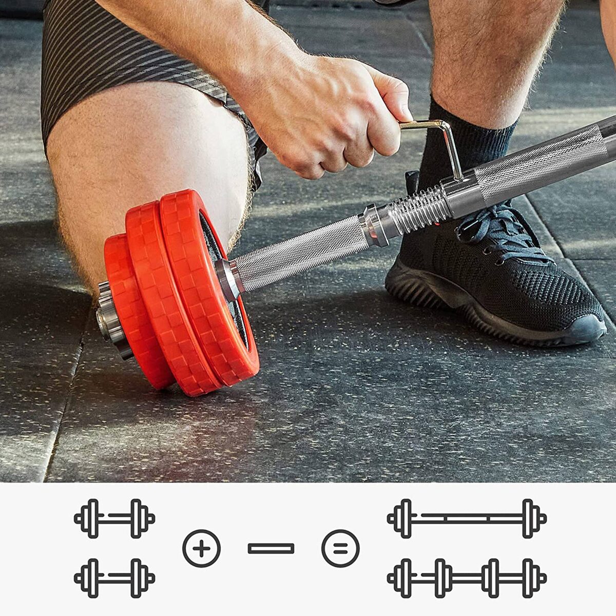 Šį svarmenų rinkinį galite paversti štanga: naudodami specialią jungtį, įtrauktą į pristatymą, štangą turėsite iš karto. Tai suteikia dar daugiau galimybių ugdyti skirtingų kūno dalių raumenis ir pasiekti geresnių treniruočių rezultatų.