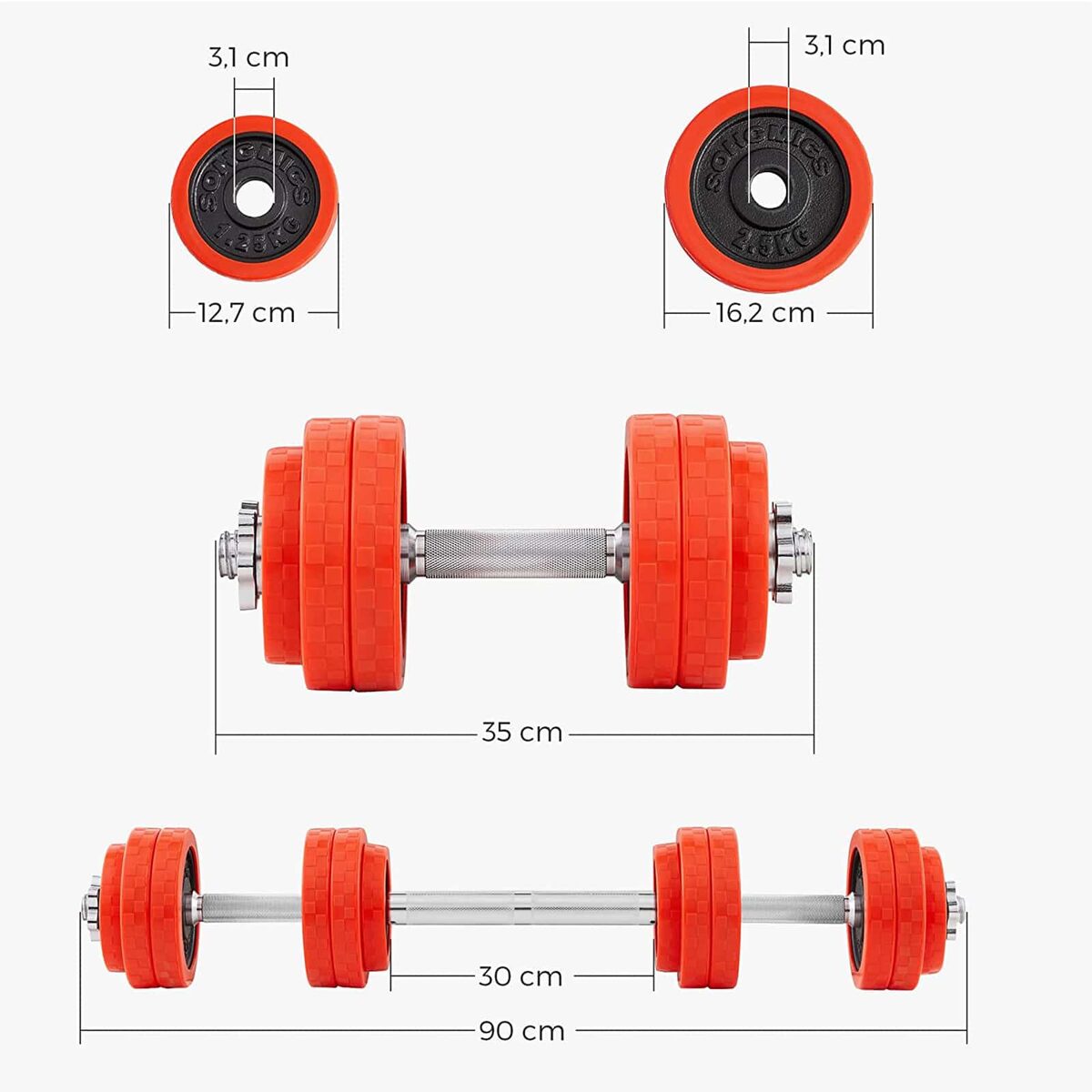 SONGMICS siūlo aukštos kokybės fitneso priedus tiems, kurie siekia idealios kūno formos. Mūsų svarmenų rinkinys buvo sukurtas siekiant pasiūlyti jums optimalią treniruočių patirtį be laiko ir erdvės apribojimų. Jis leidžia jums pritaikyti savo treniruotę pagal savo poreikius: skirtingi diskai leidžia pritaikyti svorius pagal jūsų treniruočių intensyvumą, juos tiesiog derinant. Tai leidžia sutaupyti pinigų ir vietos papildomiems svoriams.