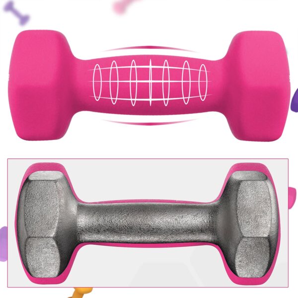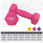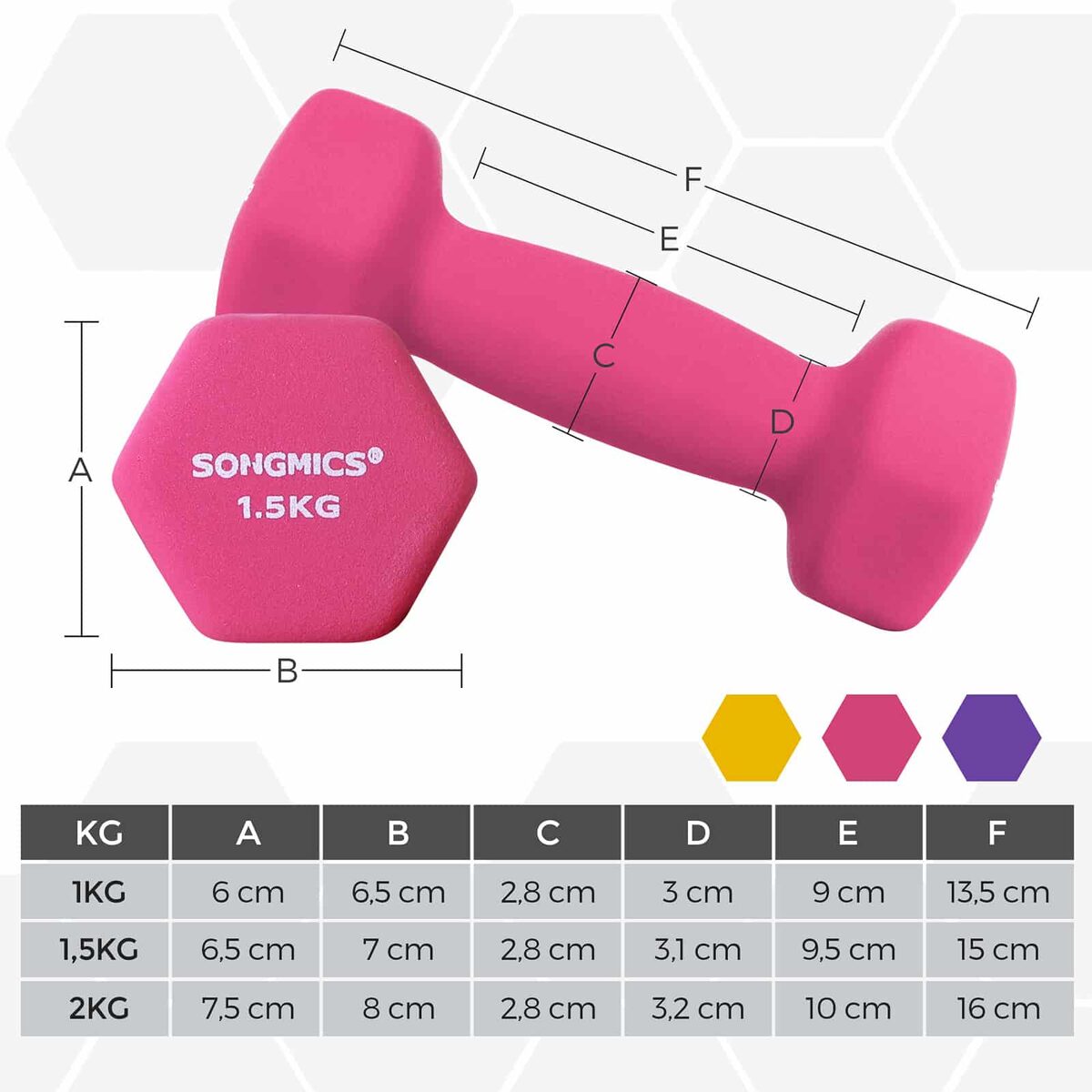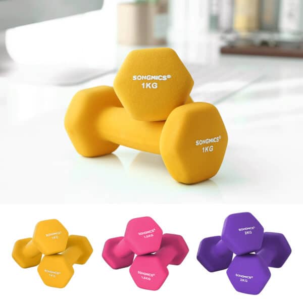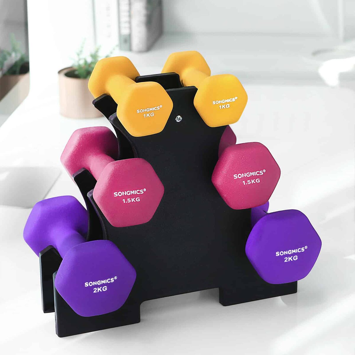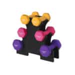Šie hanteliai stebina savo tvirta ketaus forma ir minkšta neopreno danga, todėl yra patogūs ir neslysta rankoje. Naudodami komplekte esantį stovą, hantelius taip pat galite laikyti tvarkingai ir taupydami vietą. Tai praktiškas derinys treniruotėms su nedideliu svoriu.