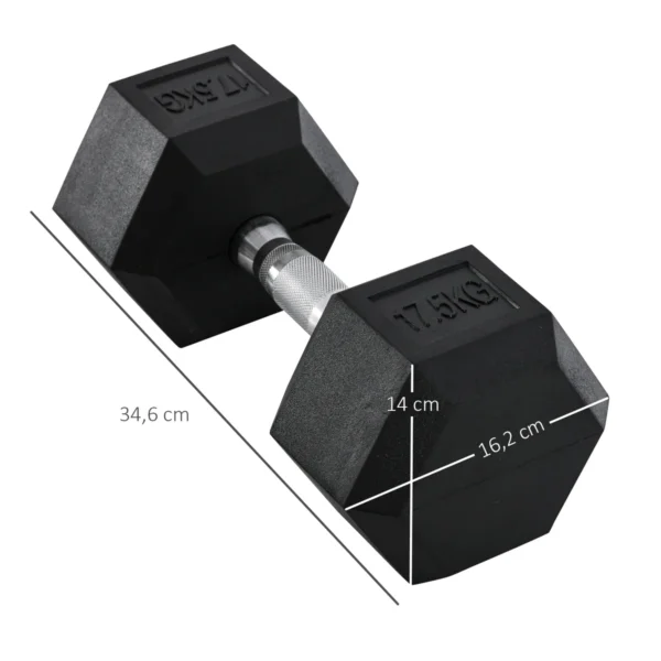 Šis šešiakampis guminis hantelis puikiai tinka jūsų kūno rengybos režimui, tinka mankštai namuose, sporto salėje ir biure. Kiekvienas svarelis pagamintas iš metalo ir gumos, kuri yra patvari ir nelengva subraižyti grindis. Riebalai garantuoja jūsų saugumą, kai pakaitomis atliekate hantelių garbanas, galvos trūkčiojimus, tricepso spyrius ir pan. Tai idealus būdas atlikti pratimų rutiną su hanteliais.