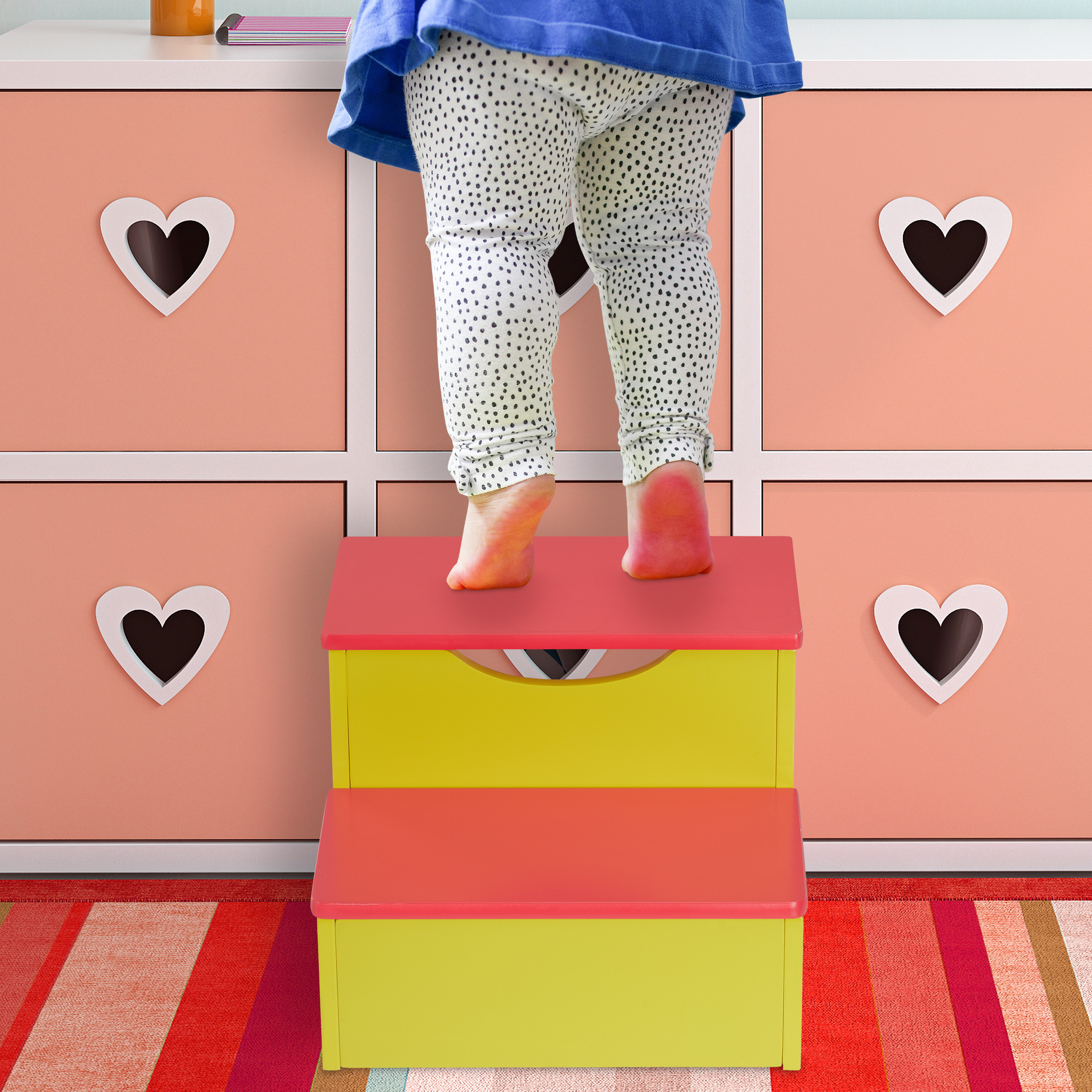Įneškite spalvų ir funkcionalumo į savo vaiko kambarį su šia žaisminga geltonos ir raudonos spalvos taburete. Ši žema, dviejų laiptelių taburetė yra ne tik puikus dekoratyvinis elementas, bet ir praktiška pagalbinė priemonė jūsų mažyliui.