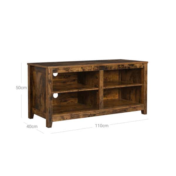 Televizijos mėgėjams! Padėkite savo televizorių ant šio patogaus TV stovo ir mėgaukitės mėgstamais TV serialais. Šis stovas ne tik suteikia stabilumą, bet ir siūlo daug vietos saugykloje. 4 atviruose skyriuose galite laikyti DVD, žaidimų konsoles ir nuotolinio valdymo pultus.