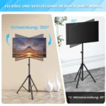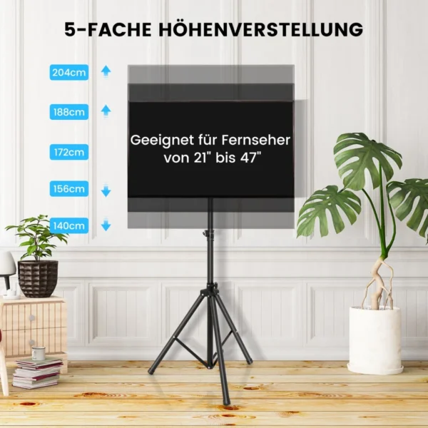 Televizoriaus stovas 53x64x204cm, juodos spalvos, yra praktiškas ir patikimas sprendimas įvairių dydžių plokščiaekraniams televizoriams. Reguliuojamo aukščio ir kampo mechanizmai leidžia patogiai pritaikyti žiūrėjimo poziciją. Metalinė konstrukcija užtikrina tvirtumą ir stabilumą jūsų svorio reikalavimams.