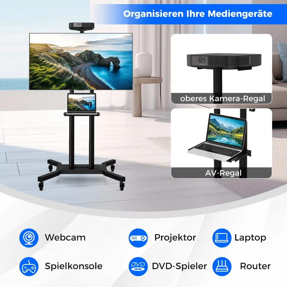 - Keturi užrakinami universalūs ratukai leidžia lengvai perkelti stendą ir pritvirtinti vietoje.