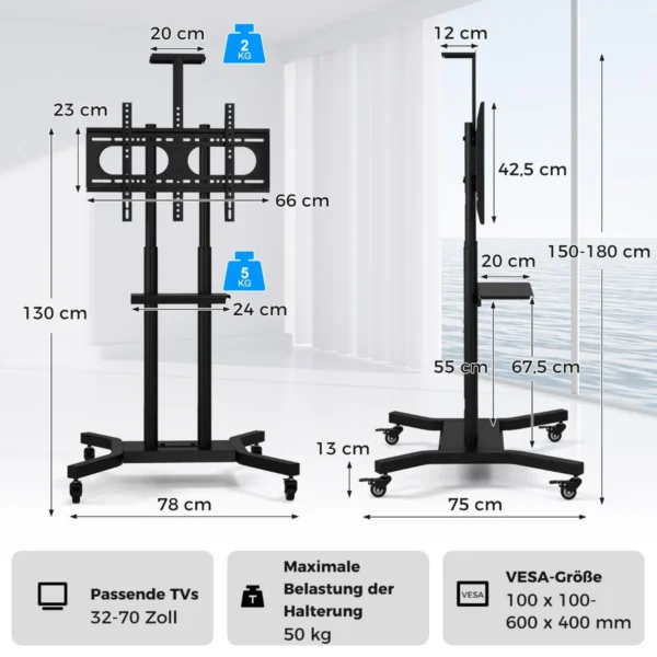 Televizoriaus stovas 78x75x180cm, juodos spalvos, skirtas 32–70 colių plokščiam arba lenktam televizoriui. Mobilus ir reguliuojamas stovas užtikrina patogų žiūrėjimo aukštį bei tvarkingą medijos įrenginių išdėstymą.