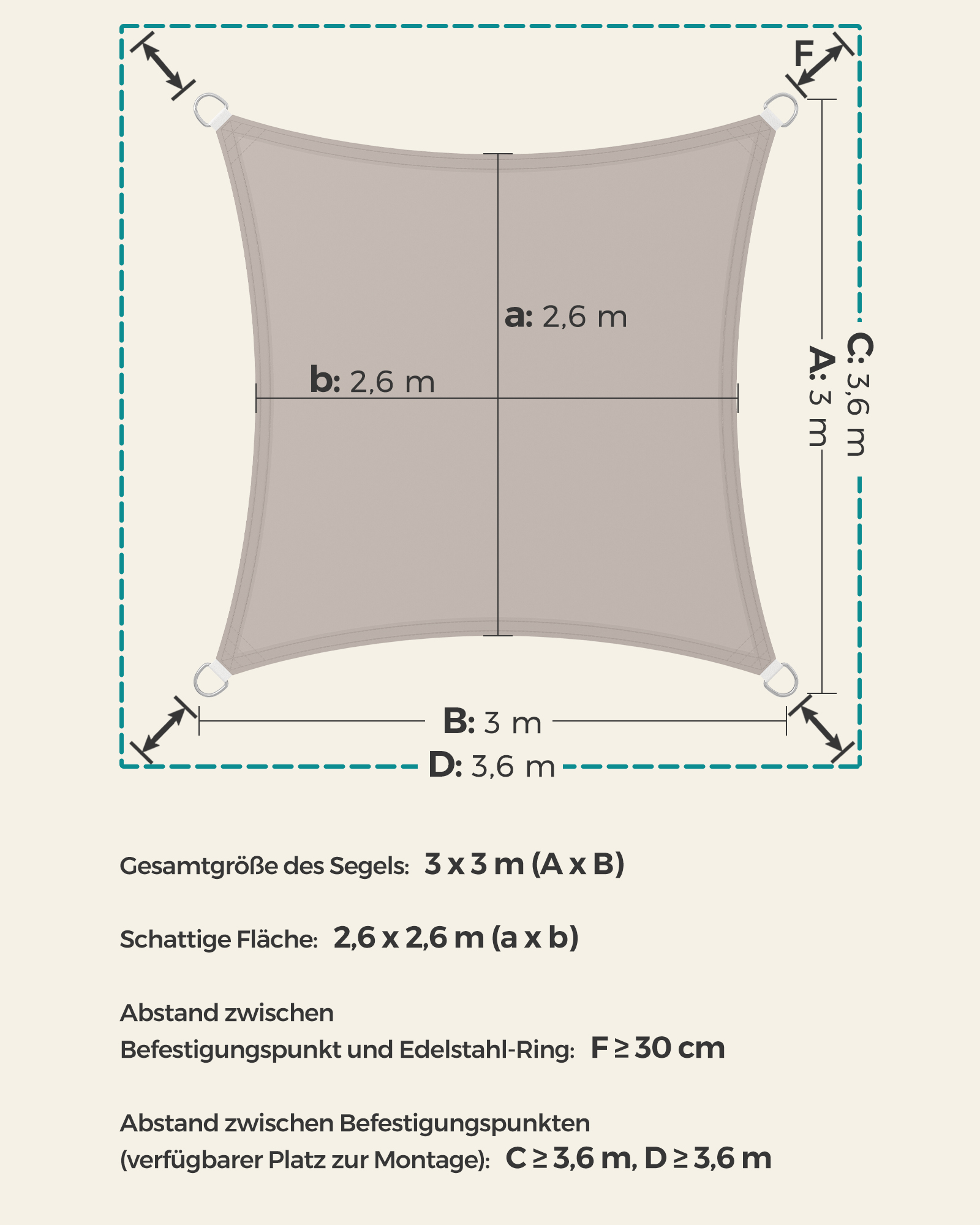 - Dydis: 3 x 3 m (Ilgis x Plotis), suteikiantis pakankamai erdvės apsaugai nuo saulės.