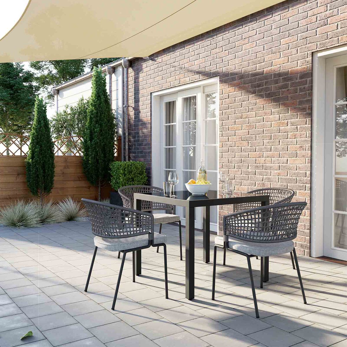 Valgykite, gerkite ir atsipalaiduokite: grynas oras, šilta saulė, švelnus vėjas – laikas atsipalaiduoti lauke su šeima! Ar norėtumėte mėgautis pusryčiais balkone ryto saulėje? Ar norėtumėte pabendrauti su savo šeima prie kavos? Ar norėtumėte surengti kokteilių vakarėlį sode ir pakviesti draugus? Šis terasinis stalas su juodo stiklo stalviršiu siūlo jums tobulą vietą ir įgyvendina visus jūsų planus!