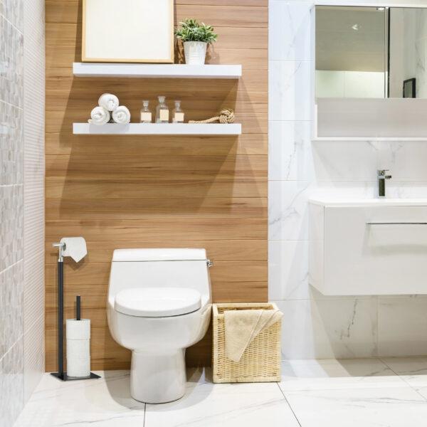 • Praktiškumas: Su šiuo laikikliu tualetinis popierius visada bus po ranka. Atviras bėgelis leidžia lengvai išvynioti popierių, o papildomų ritinėlių laikymo funkcija užtikrina, kad niekada nepritrūksite atsargų.