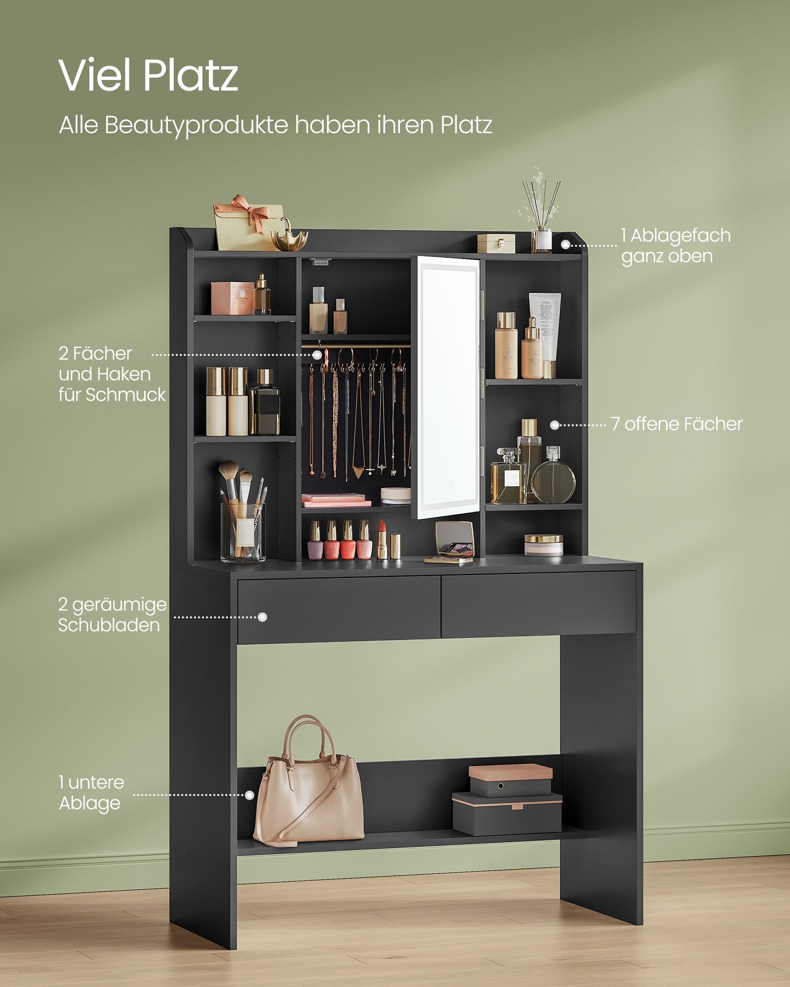 - Funkcionalumas: Įrengtas su stalčiais ir lentynėlėmis, kad galėtumėte patogiai laikyti kosmetiką ir aksesuarus.