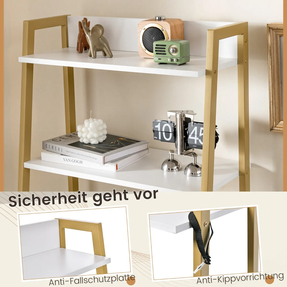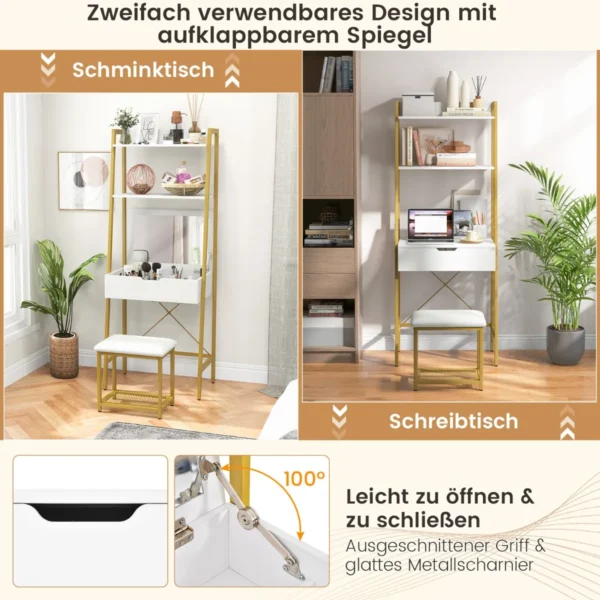 - Kopėčių stiliaus tualetinis staliukas su sulankstomu veidrodžiu, lengvai transformuojamas į rašomąjį stalą.