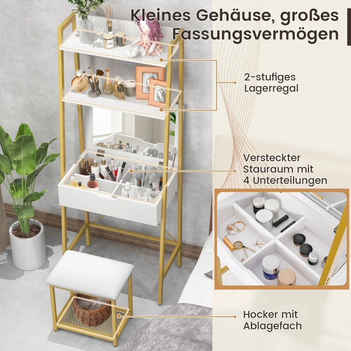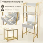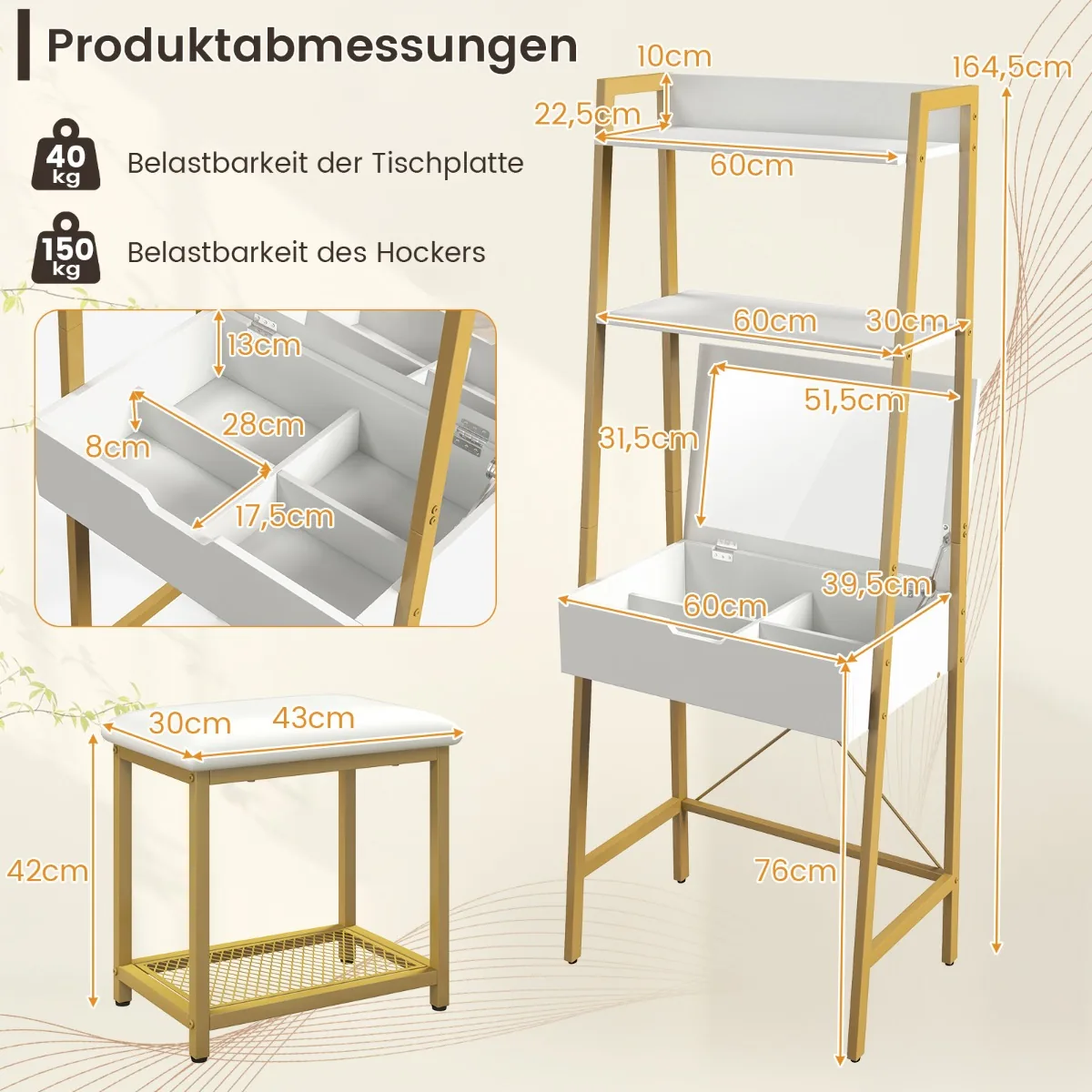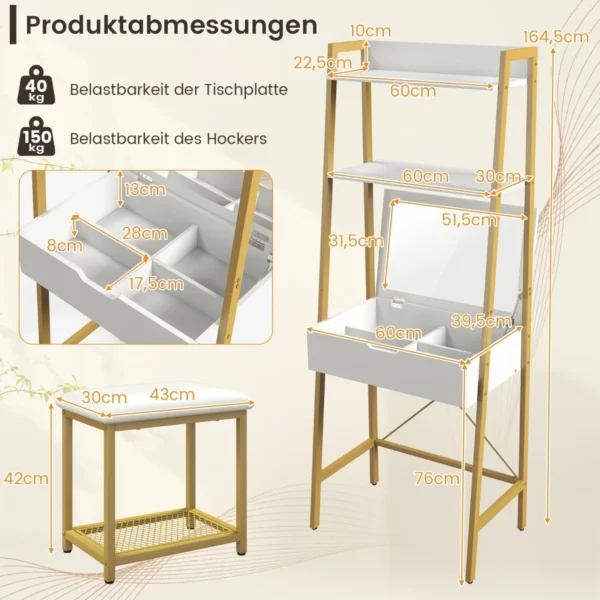 Tualetinis staliukas su taburetė 60×39,5×164,5cm baltos ir auksinės spalvos puikiai tinka namų erdvei atnaujinti. Komplektas suteikia funkcionalią vietą makiažui ar darbui, derinant praktiškumą ir taupymą vietoje. Sulankstomas veidrodis ir keli saugojimo skyriai užtikrina patogų kasdienį naudojimą.