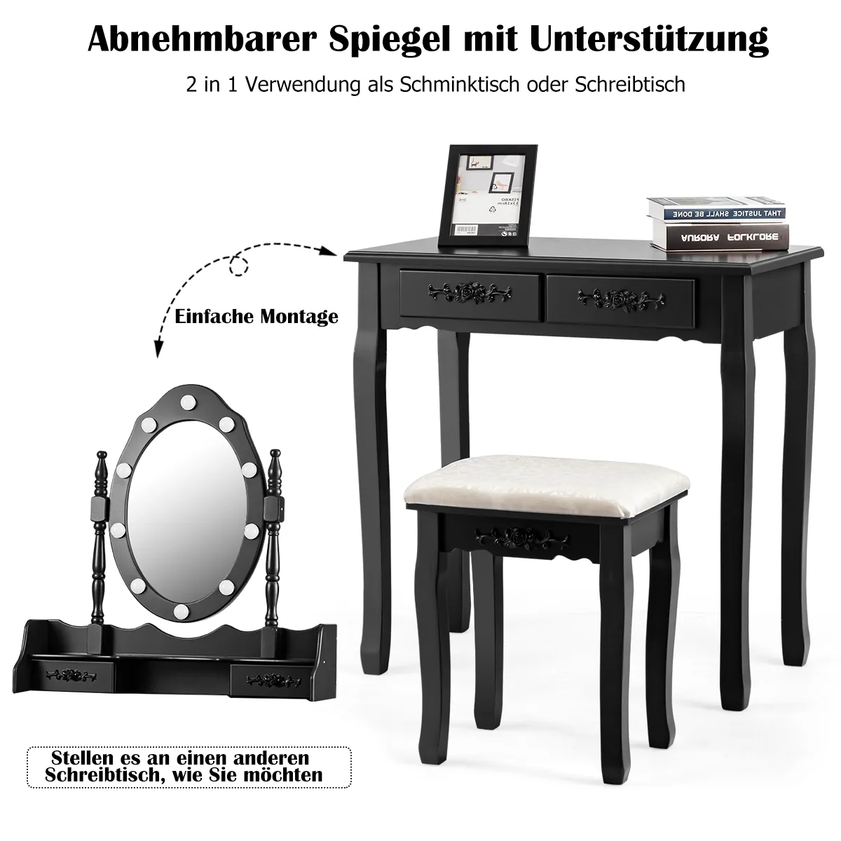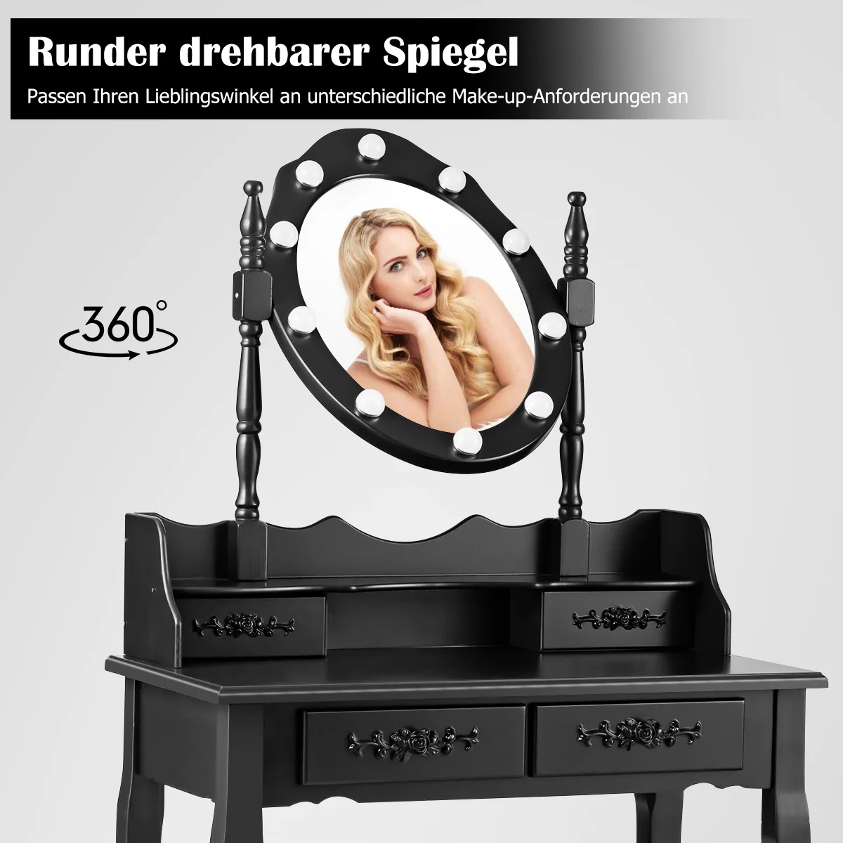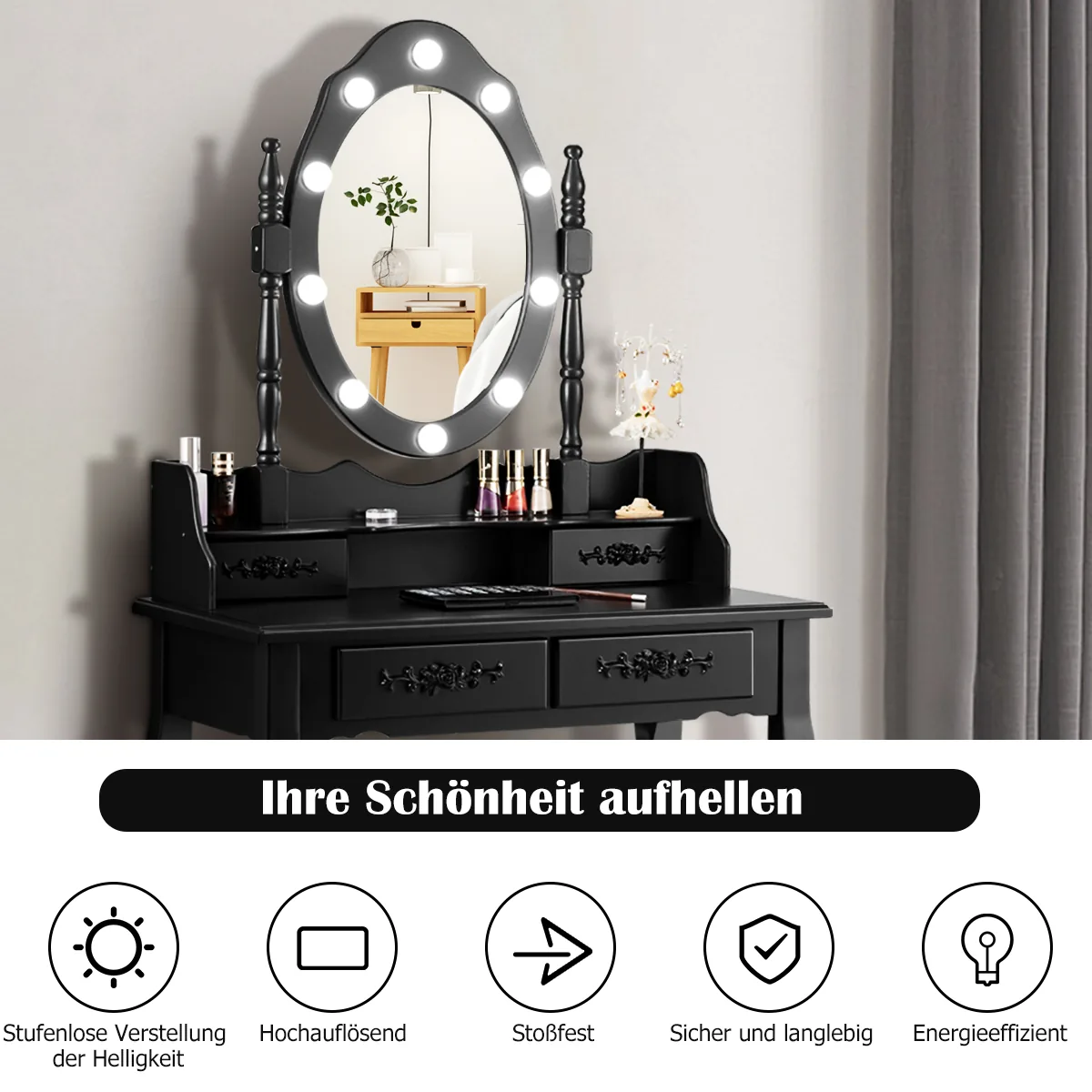 - Tualetinis staliukas su ovaliu veidrodžiu ir integruotomis LED lemputėmis, užtikrinantis gerą apšvietimą makiažui.