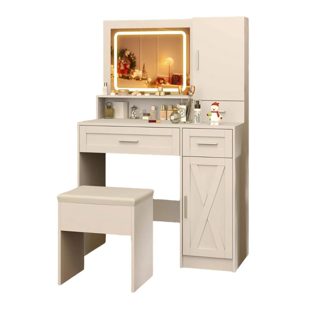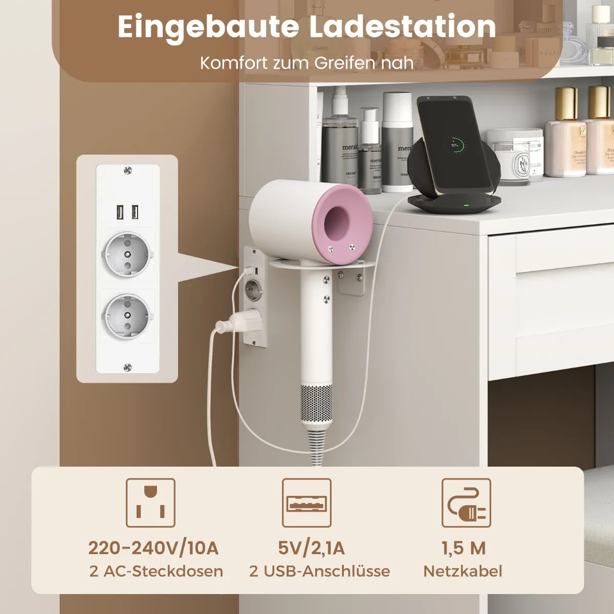 Tualetinis staliukas su taburetė baltos spalvos – funkcionalus sprendimas miegamojo ar prieškambario interjerui. 90 x 40 x 136,5 cm dydžio komplektas su integruota įkrovimo stotele ir LED apšviestu veidrodžiu užtikrina patogų kasdienį naudojimą ir tvarkingą kosmetikos laikymą.