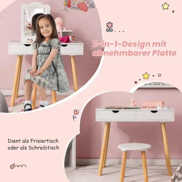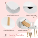 Tualetinis staliukas vaikams 70x37x100cm baltos/šviesiai rudos spalvos yra praktiškas ir funkcionalus sprendimas mažiesiems. Šis vaikiškas kosmetinis staliukas su kėdute sujungia kosmetinį ir rašomąjį stalą viename, leidžiant vaikams patogiai atlikti kasdienes veiklas.